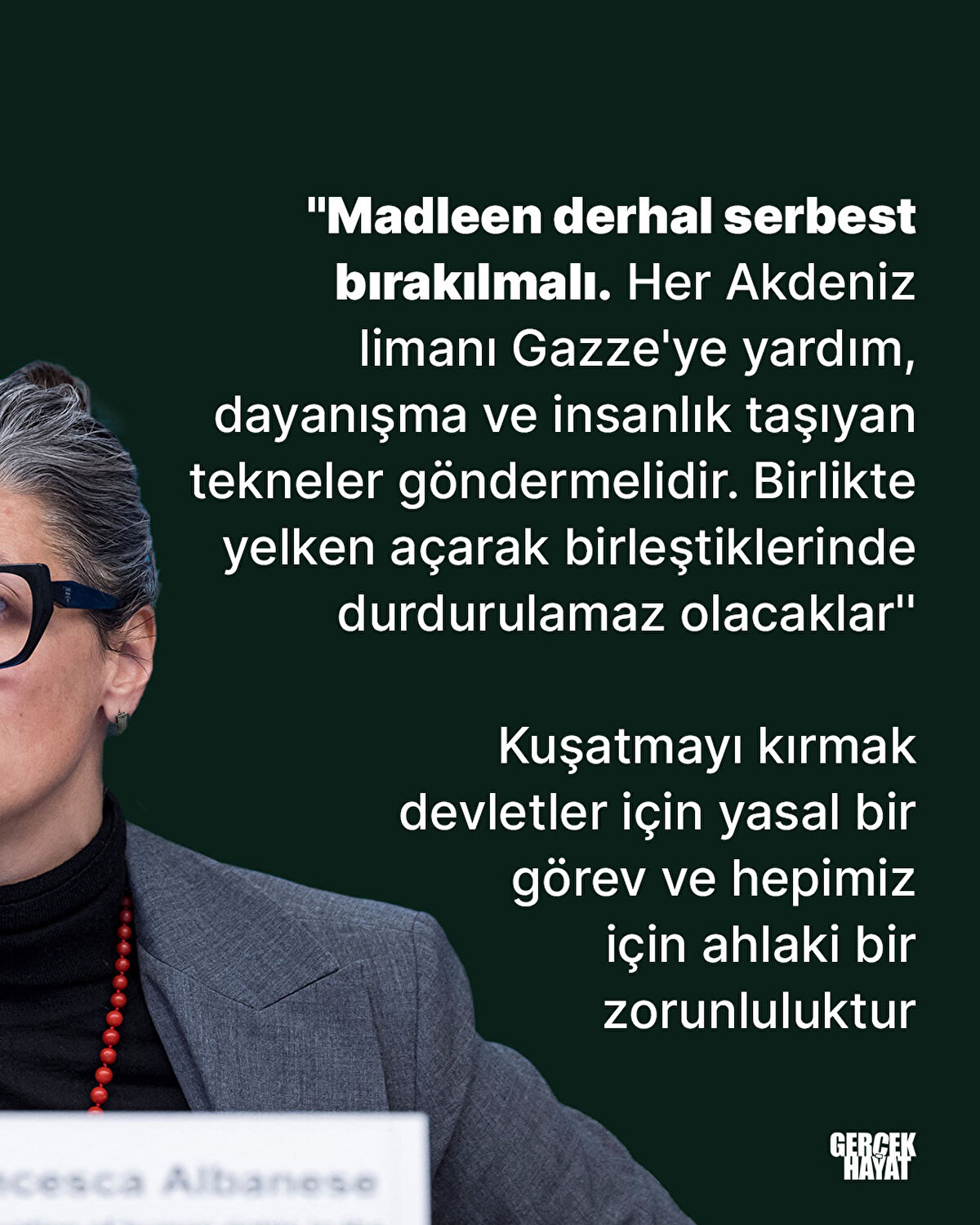 BM Filistin Özel Raportörü Francesca Albanese, X hesabından “Her Akdeniz limanı Gazze'ye tekneler göndermeli” çağrısında bulundu ve “Birlikte durdurulamaz olacaklar” dedi.