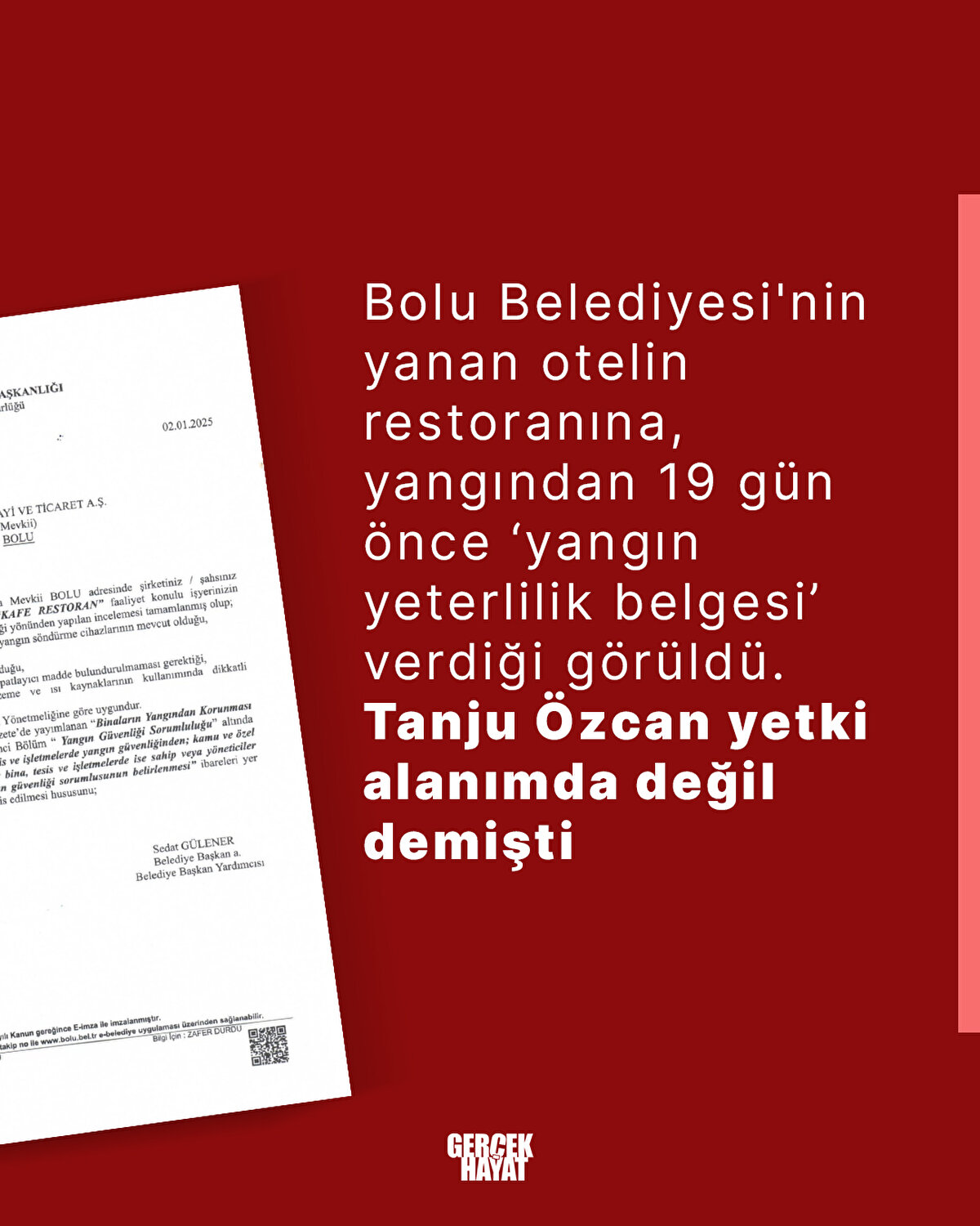 Bolu Belediye Başkanı Tanju Özcan, yanan otelin denetlenmesinin yetki alanında olmadığını söylemişti.