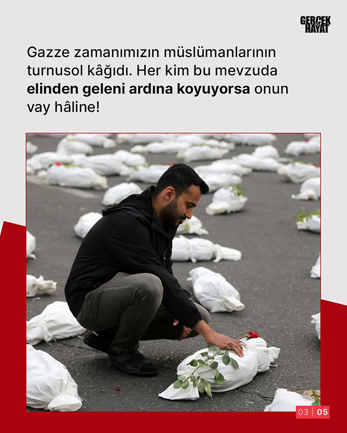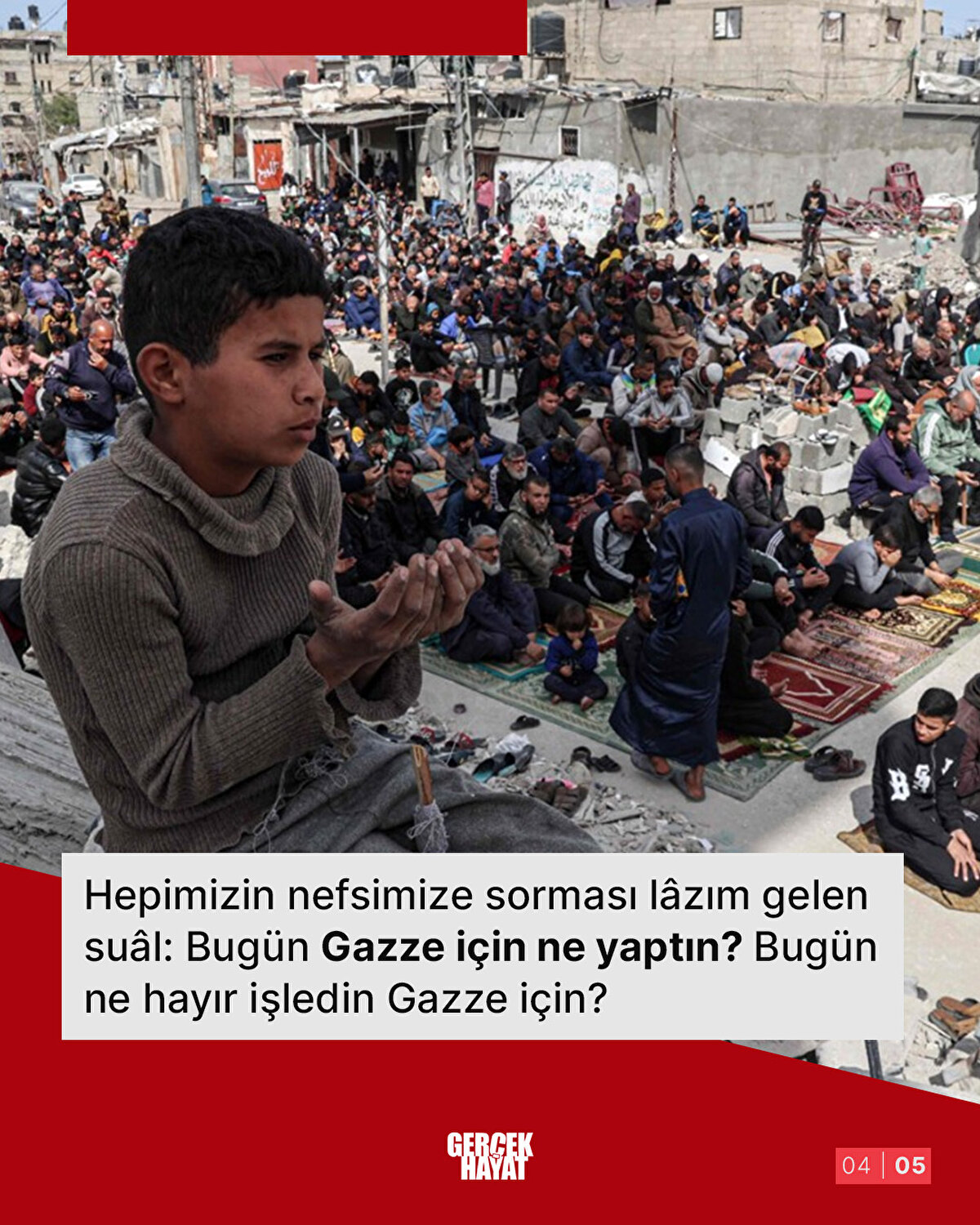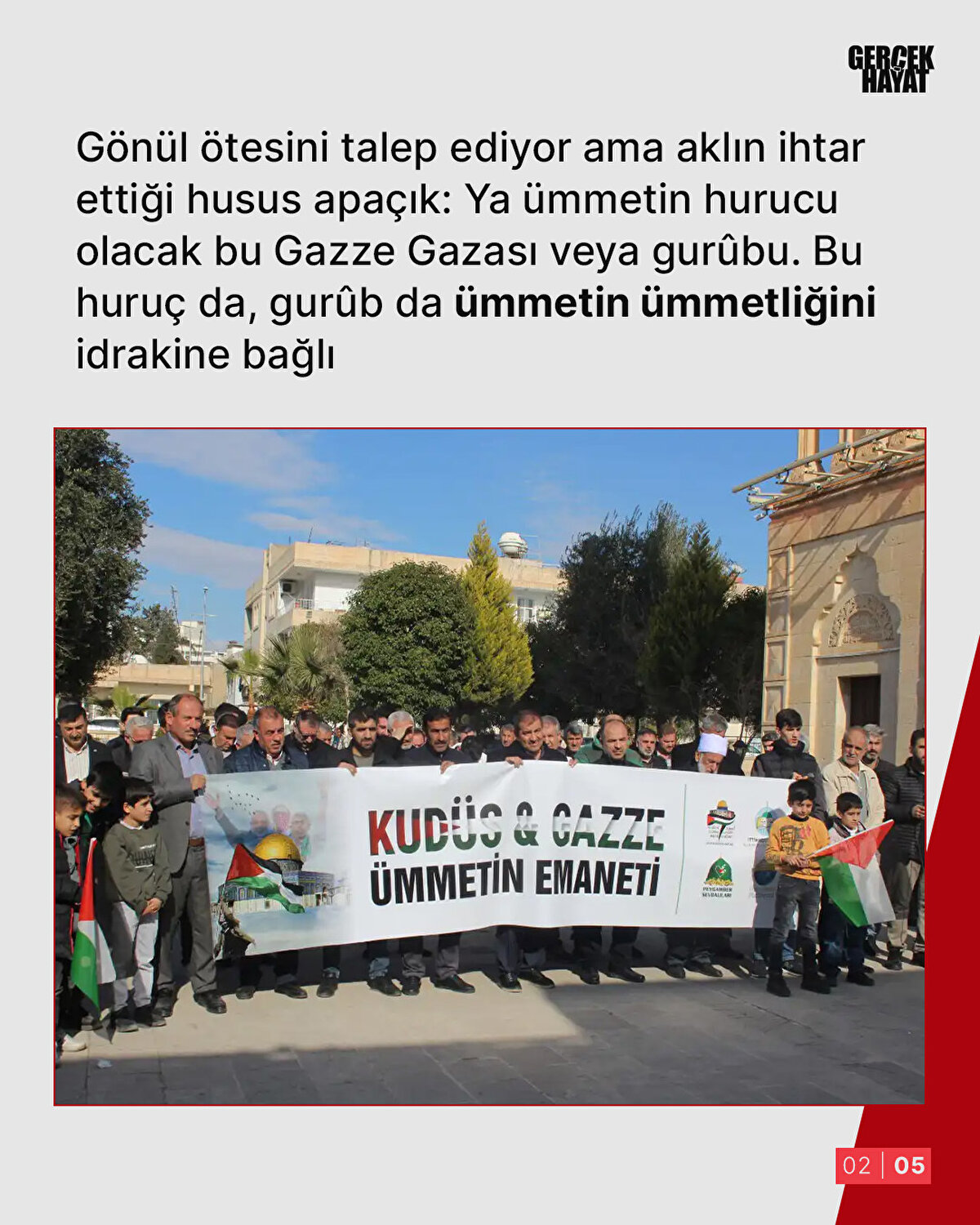 Gönül ötesini talep ediyor ama aklın ihtar ettiği husus apaçık: Ya ümmetin hurucu olacak bu Gazze Gazası veya gurûbu. Bu huruç da, gurûb da ümmetin ümmetliğini idrakine bağlı. Gazze zamanımızın müslümanlarının turnusol kâğıdı. Her kim bu mevzuda elinden geleni ardına koyuyorsa onun vay hâline! Hepimizin nefsimize sorması lâzım gelen suâl: Bugün Gazze için ne yaptın? Bugün ne hayır işledin Gazze için?