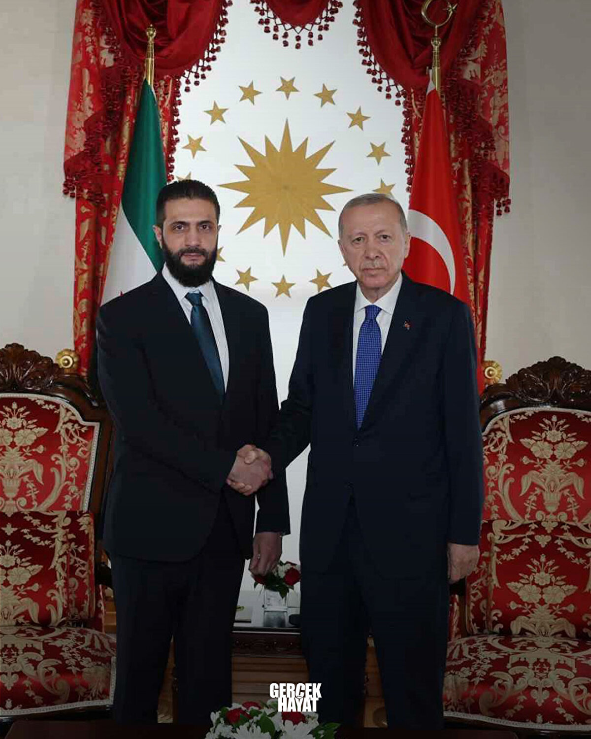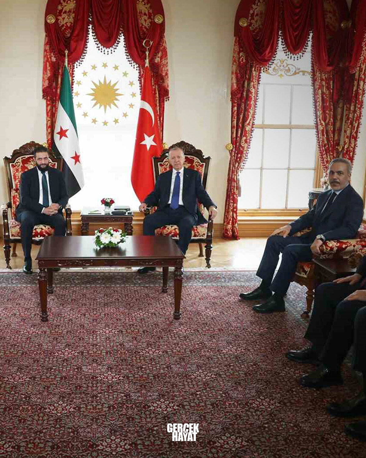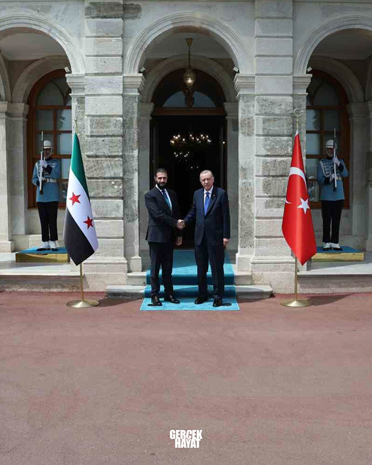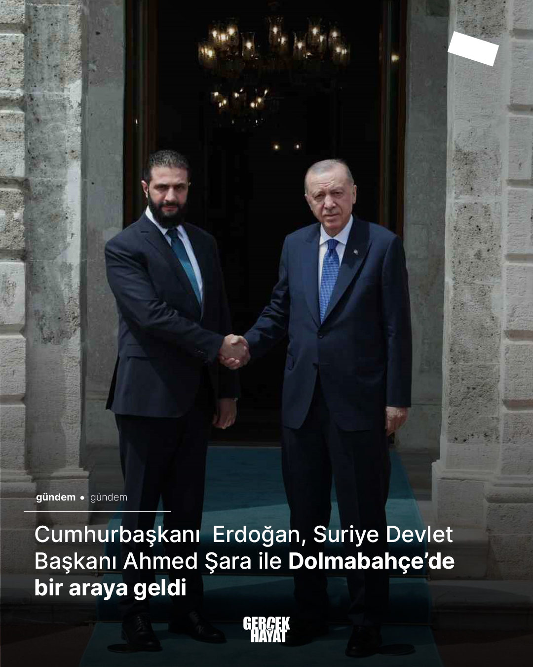 Cumhurbaşkanı Erdoğan, Suriye Cumhurbaşkanı Şara'yı Dolmabahçe Çalışma Ofisi'nde resmi törenle karşıladı. Görüşmede, Dışişleri Bakanı Hakan Fidan, Milli Savunma Bakanı Yaşar Güler, MİT Başkanı İbrahim Kalın, Savunma Sanayii Başkanı Haluk Görgün, Suriye Dışişleri Bakanı Esad Hasan Şeybani ve bazı yetkililer de yer aldı.