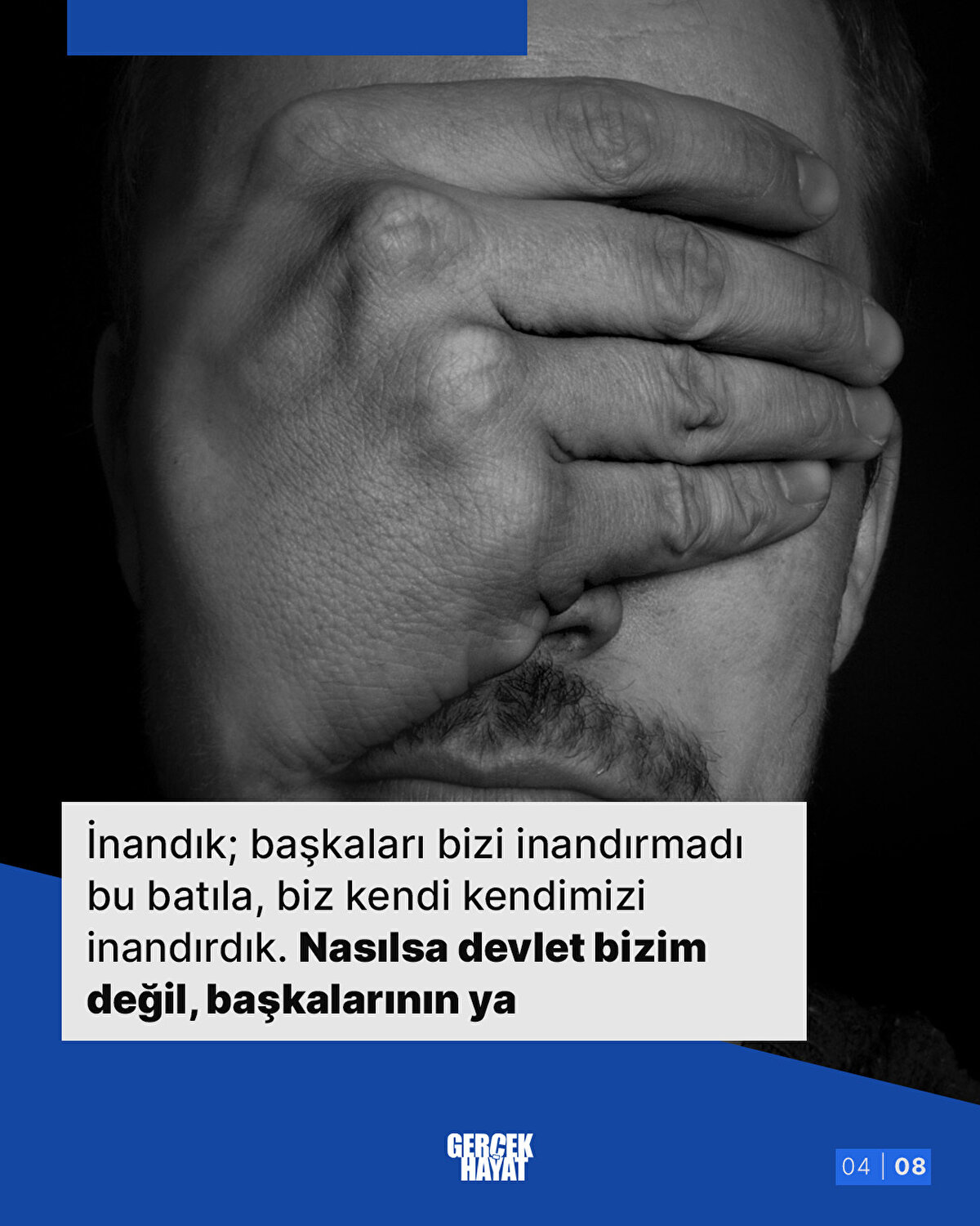 İnandık; başkaları bizi inandırmadı bu batıla, biz kendi kendimizi inandırdık. Nasılsa devlet bizim değil, başkalarının ya.