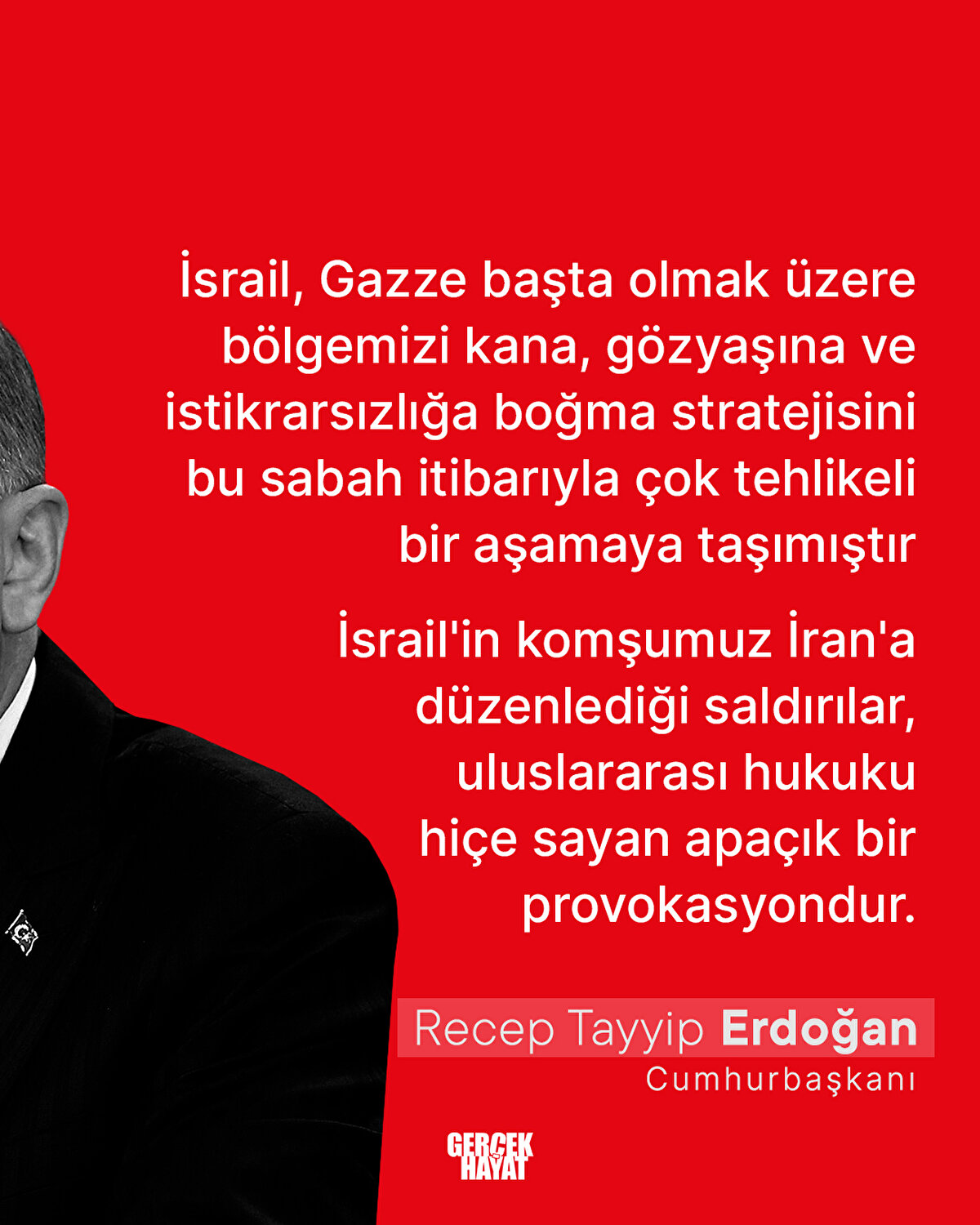 ''İsrail, Gazze başta olmak üzere bölgemizi kana, gözyaşına ve istikrarsızlığa boğma stratejisini bu sabah itibarıyla çok tehlikeli bir aşamaya taşımıştır İsrail'in komşumuz İran'a düzenlediği saldırılar, uluslararası hukuku hiçe sayan apaçık bir provokasyondur.''