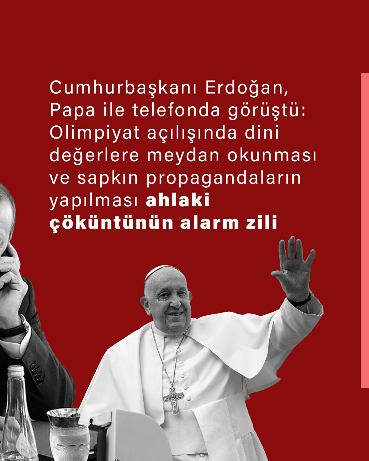 Erdoğan , Papa'yı arayarak "Olimpiyat açılışında sapkın propagandaların yapılması ahlaki çöküntünün alarm zili" ifadelerini kullandı