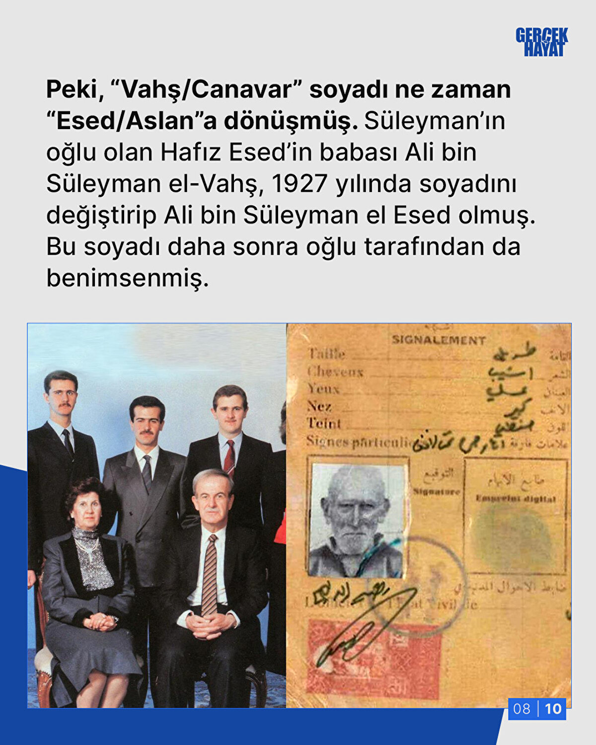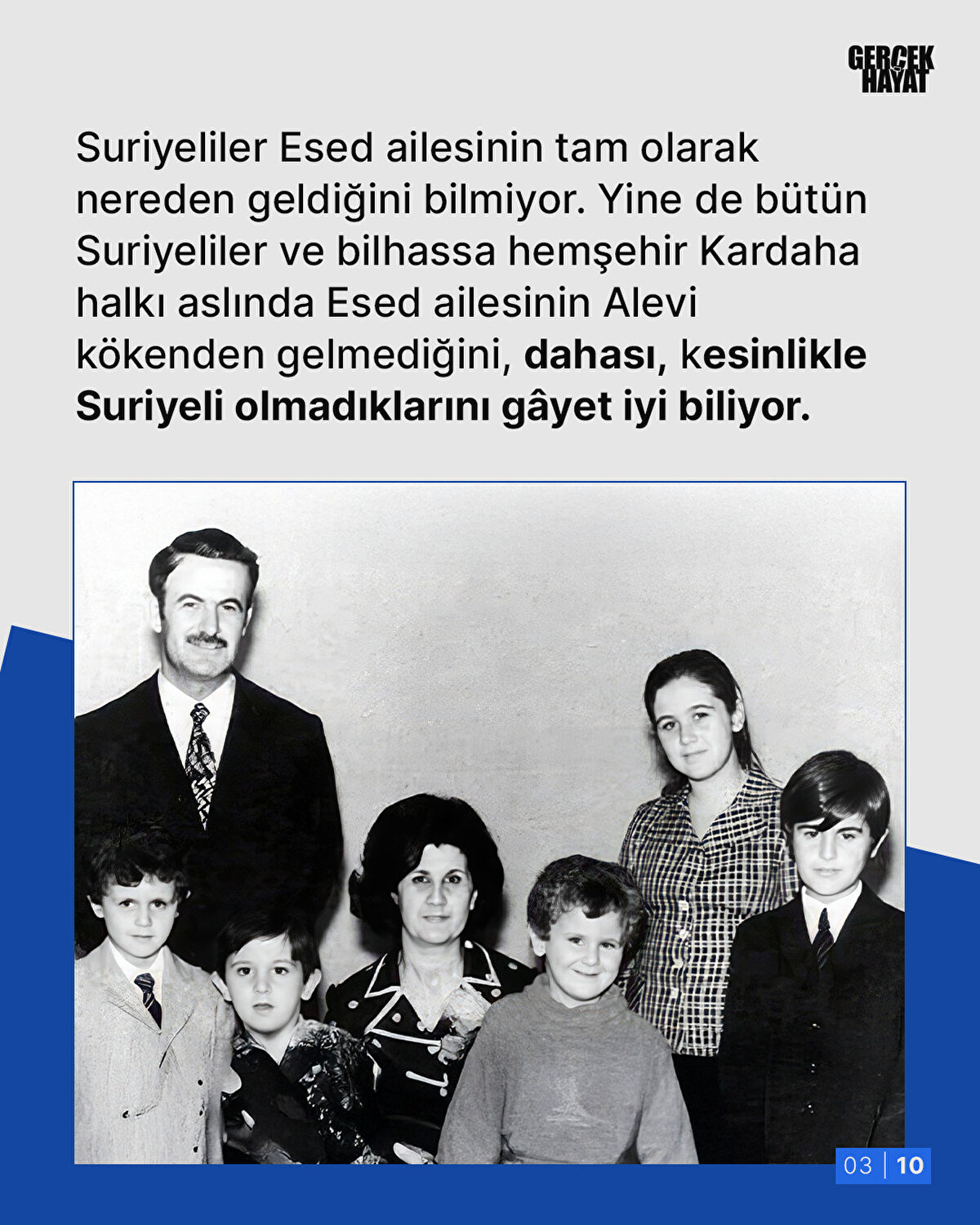 Suriyeliler Esed ailesinin tam olarak nereden geldiğini bilmiyor. Yine de bütün Suriyeliler ve bilhassa hemşehir Kardaha halkı aslında Esed ailesinin Alevi kökenden gelmediğini, dahası, kesinlikle Suriyeli olmadıklarını gâyet iyi biliyor.