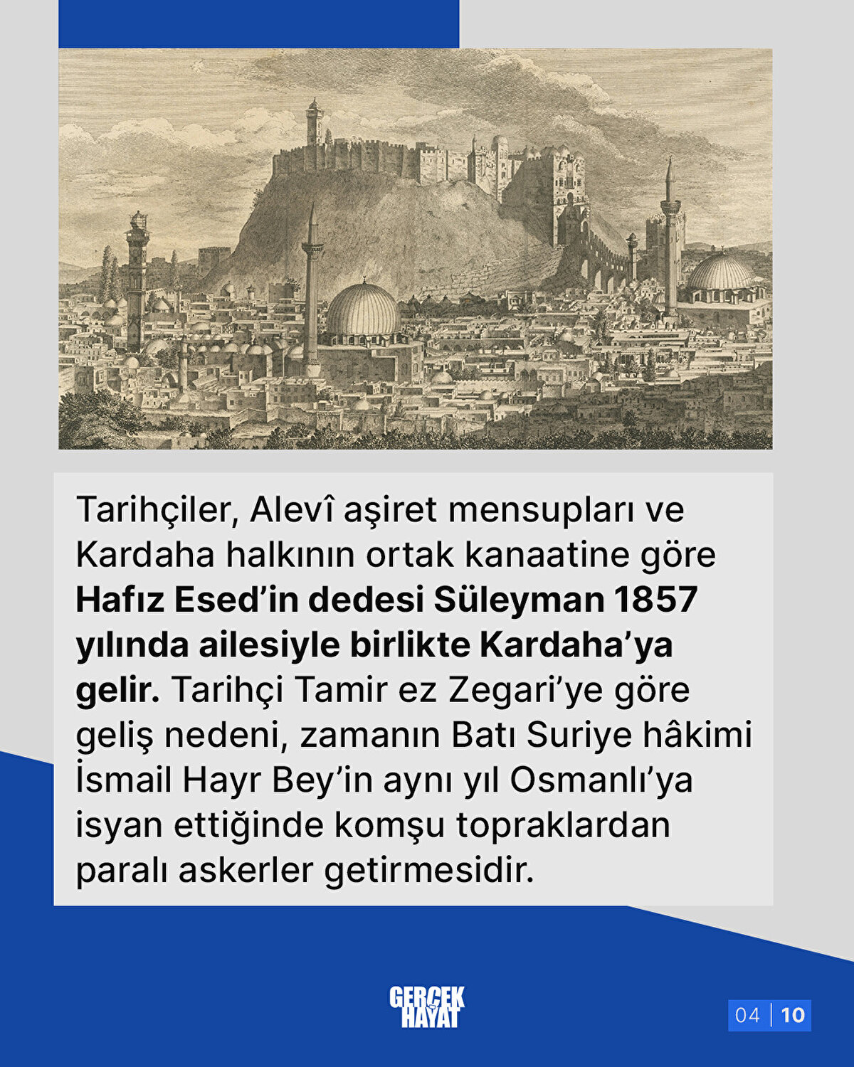 Tarihçiler, Alevî aşiret mensupları ve Kardaha halkının ortak kanaatine göre Hafız Esed'in dedesi Süleyman 1857 yılında ailesiyle birlikte Kardaha'ya gelir. Tarihçi Tamir ez Zegari'ye göre geliş nedeni, zamanın Batı Suriye hâkimi İsmail Hayr Bey'in aynı yıl Osmanlı'ya isyan ettiğinde komşu topraklardan paralı askerler getirmesidir.