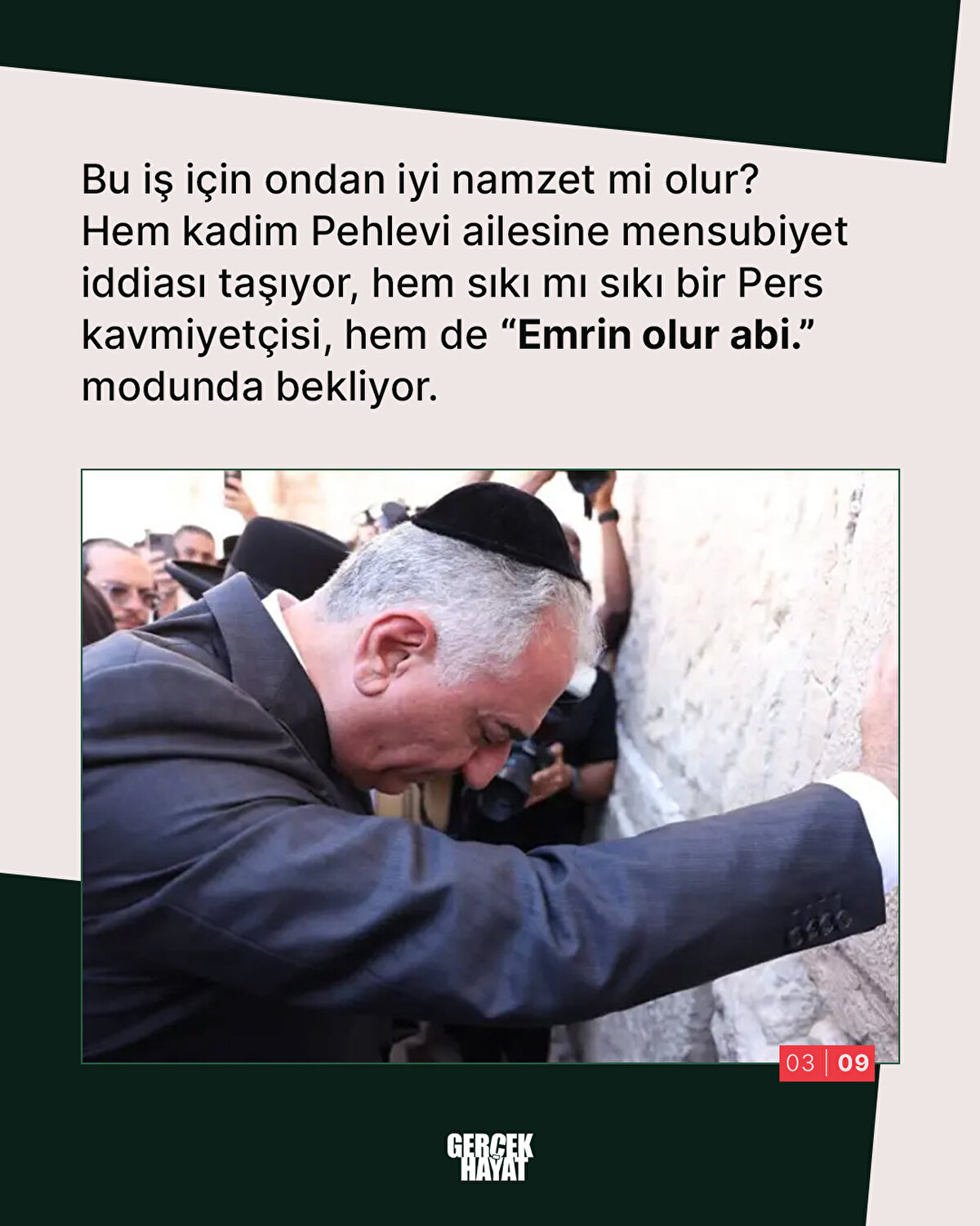 Bu iş için ondan iyi namzet mi olur? Hem kadim Pehlevi ailesine mensubiyet iddiası taşıyor, hem sıkı mı sıkı bir Pers kavmiyetçisi, hem de “Emrin olur abi." modunda bekliyor.