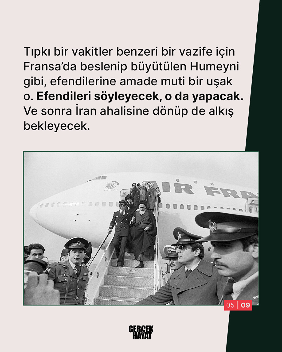Tıpkı bir vakitler benzeri bir vazife için Fransa'da beslenip büyütülen Humeyni gibi, efendilerine amade muti bir uşak o. Efendileri söyleyecek, o da yapacak. Ve sonra İran ahalisine dönüp de alkış bekleyecek.