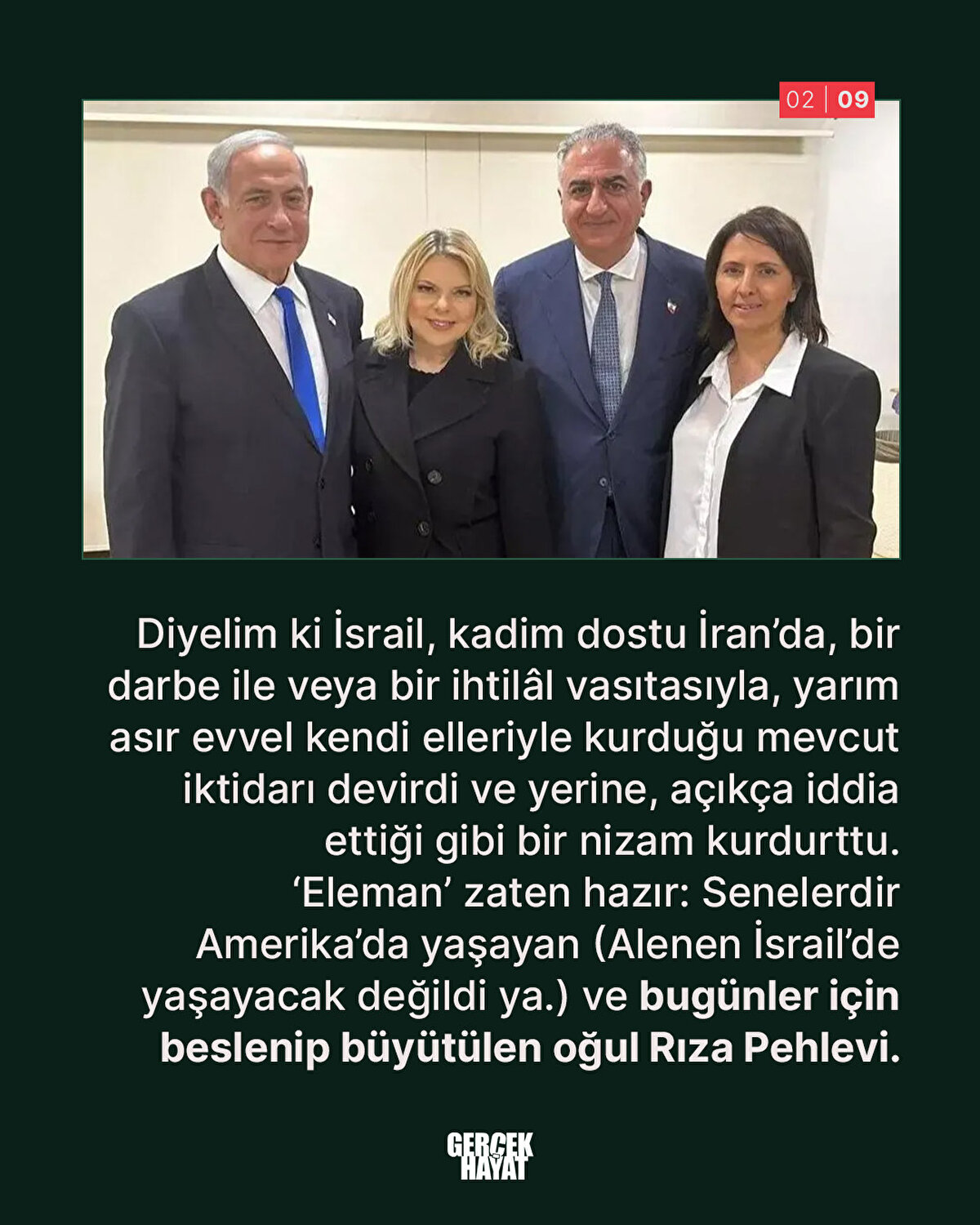 Diyelim ki İsrail, kadim dostu İran'da, bir darbe ile veya bir ihtilâl vasıtasıyla, yarım asır evvel kendi elleriyle kurduğu mevcut iktidarı devirdi ve yerine, açıkça iddia ettiği gibi bir nizam kurdurttu. 'Eleman' zaten hazır: Senelerdir Amerika'da yaşayan (Alenen İsrail'de yaşayacak değildi ya.) ve bugünler için beslenip büyütülen oğul Rıza Pehlevi.