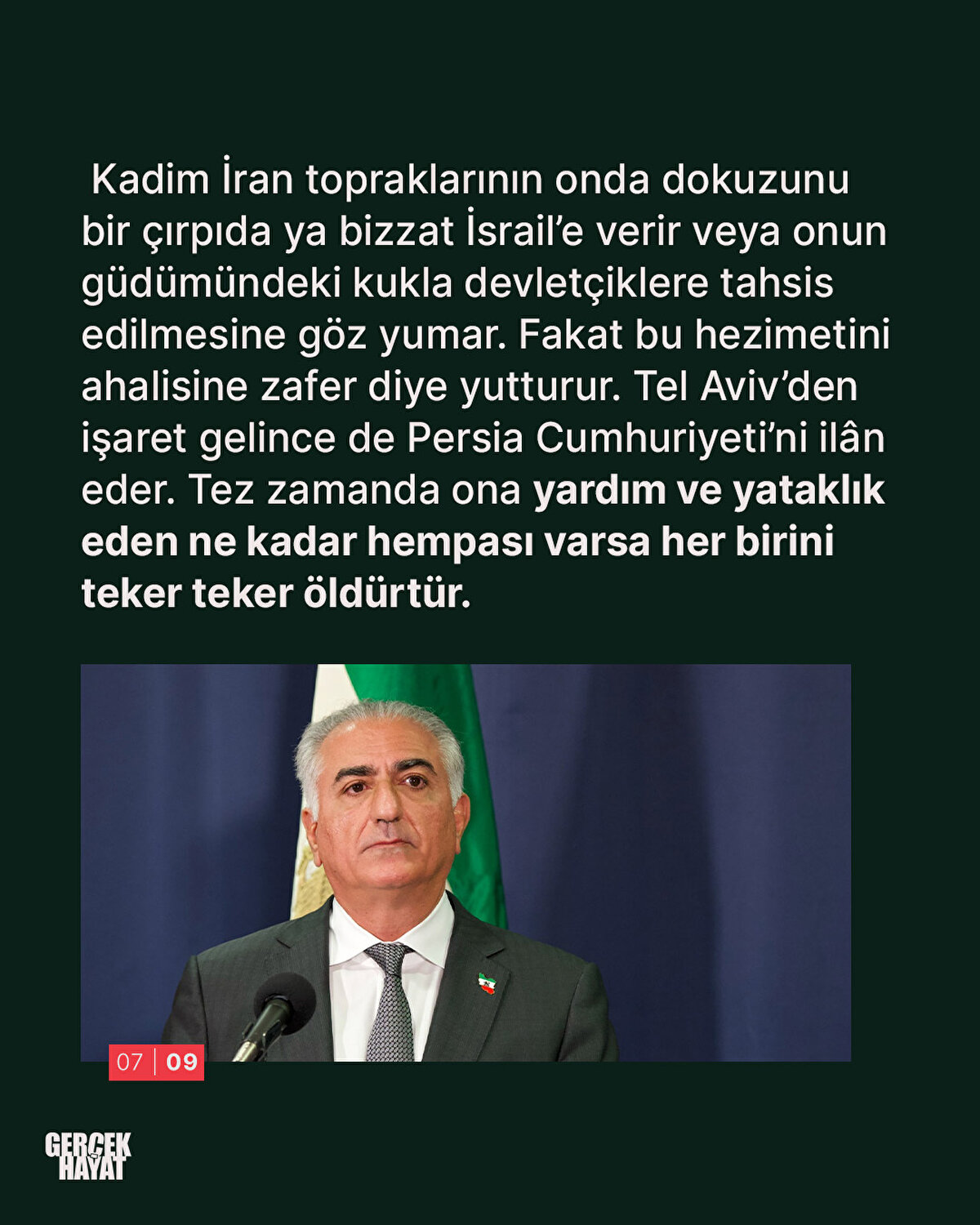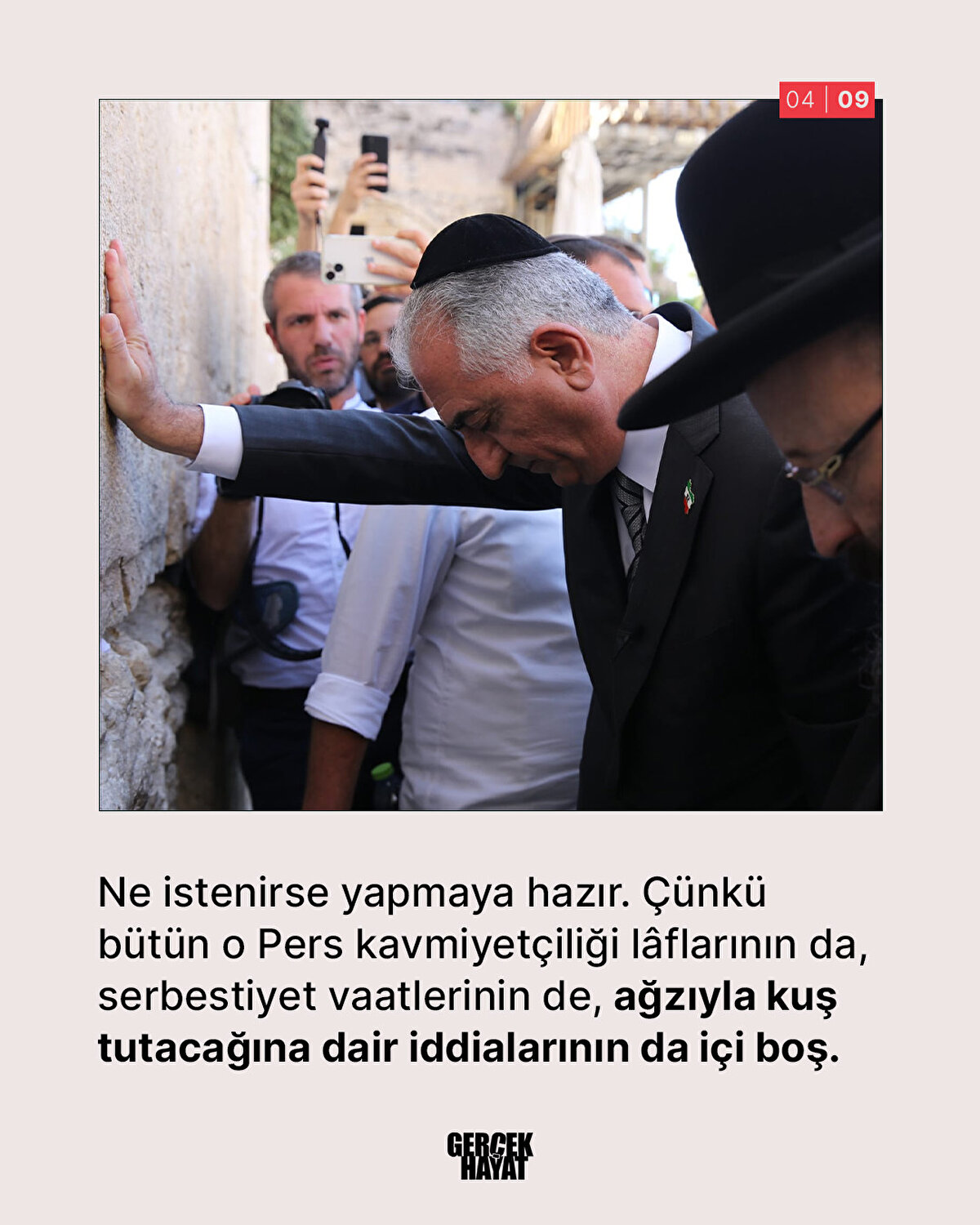 Ne istenirse yapmaya hazır. Çünkü bütün o Pers kavmiyetçiliği lâflarının da, serbestiyet vaatlerinin de, ağzıyla kuş tutacağına dair iddialarının da içi boş.