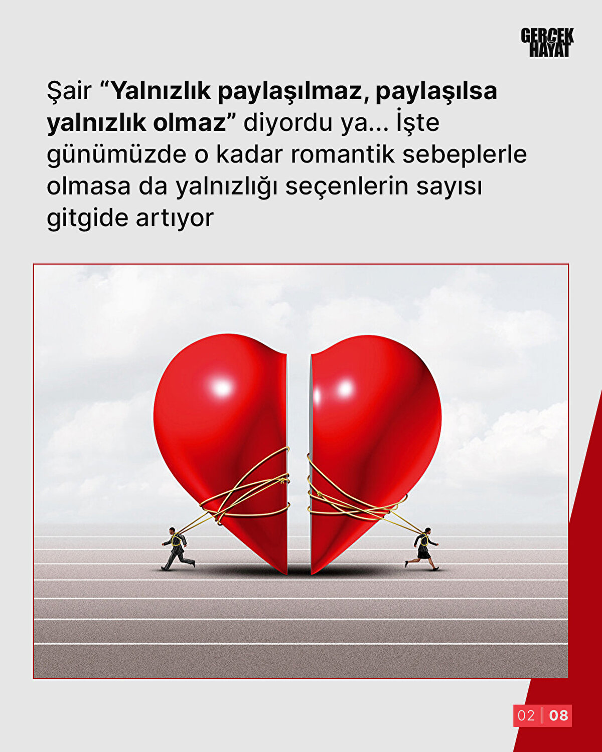 Şair “Yalnızlık paylaşılmaz, paylaşılsa yalnızlık olmaz” diyordu ya... İşte günümüzde o kadar romantik sebeplerle olmasa da yalnızlığı seçenlerin sayısı gitgide artıyor. Toplumda evlenmenin, aile kurmanın zorluğu ve gereksizliği sürekli vurgulanırken, artan tahammülsüzlük de bu kötü tercihi kolaylaştırıyor. Bu yozlaşmaya başta uzun eğitim süresi, sosyal dayatmaların yol açtığı ekonomik nedenler de eklenince yalnızlığa itilenler önemli bir yekûn olarak karşımıza çıkıyor. Son zamanlarda bu iki kategoriye bir de 'dijital yalnızlık' eklendi