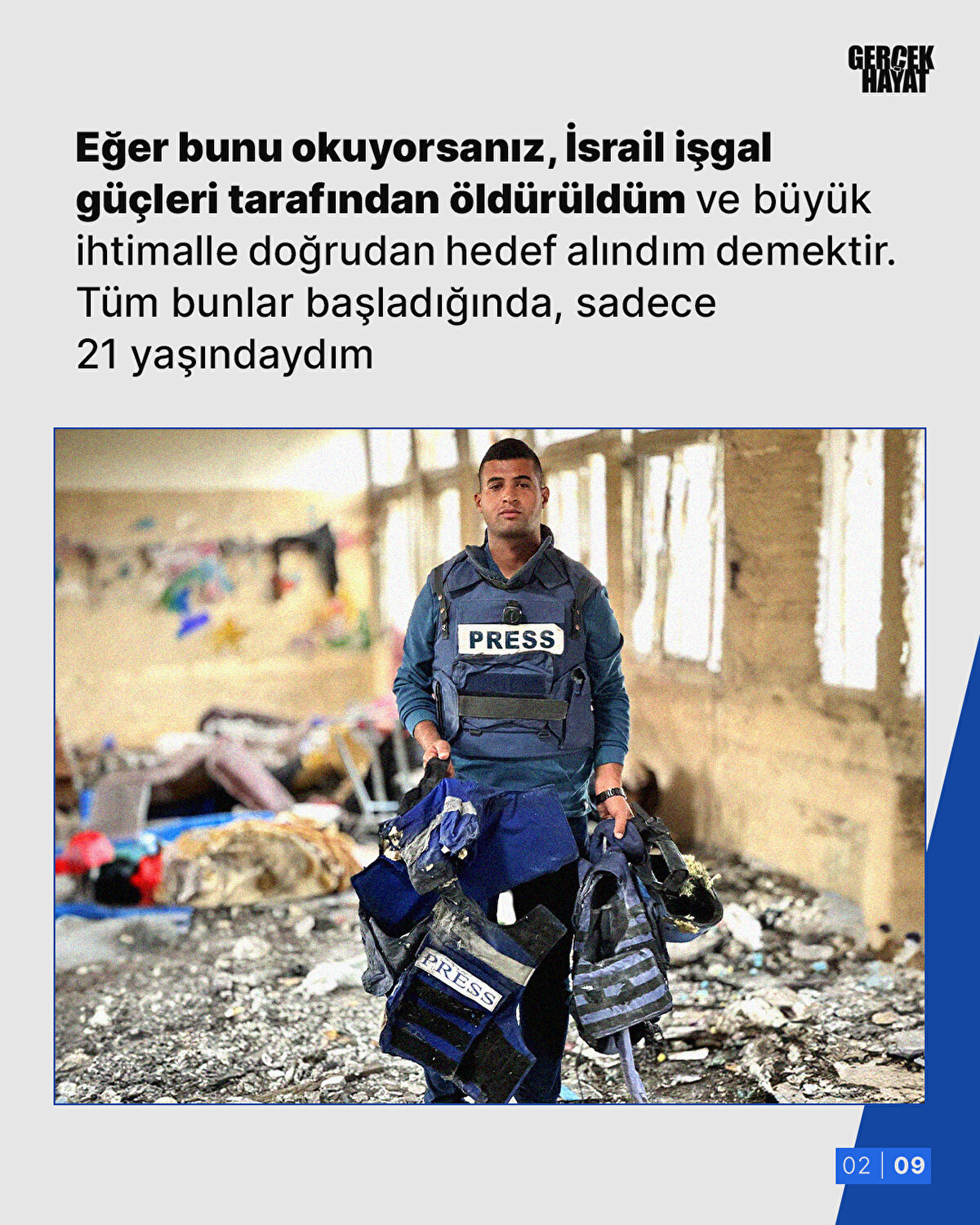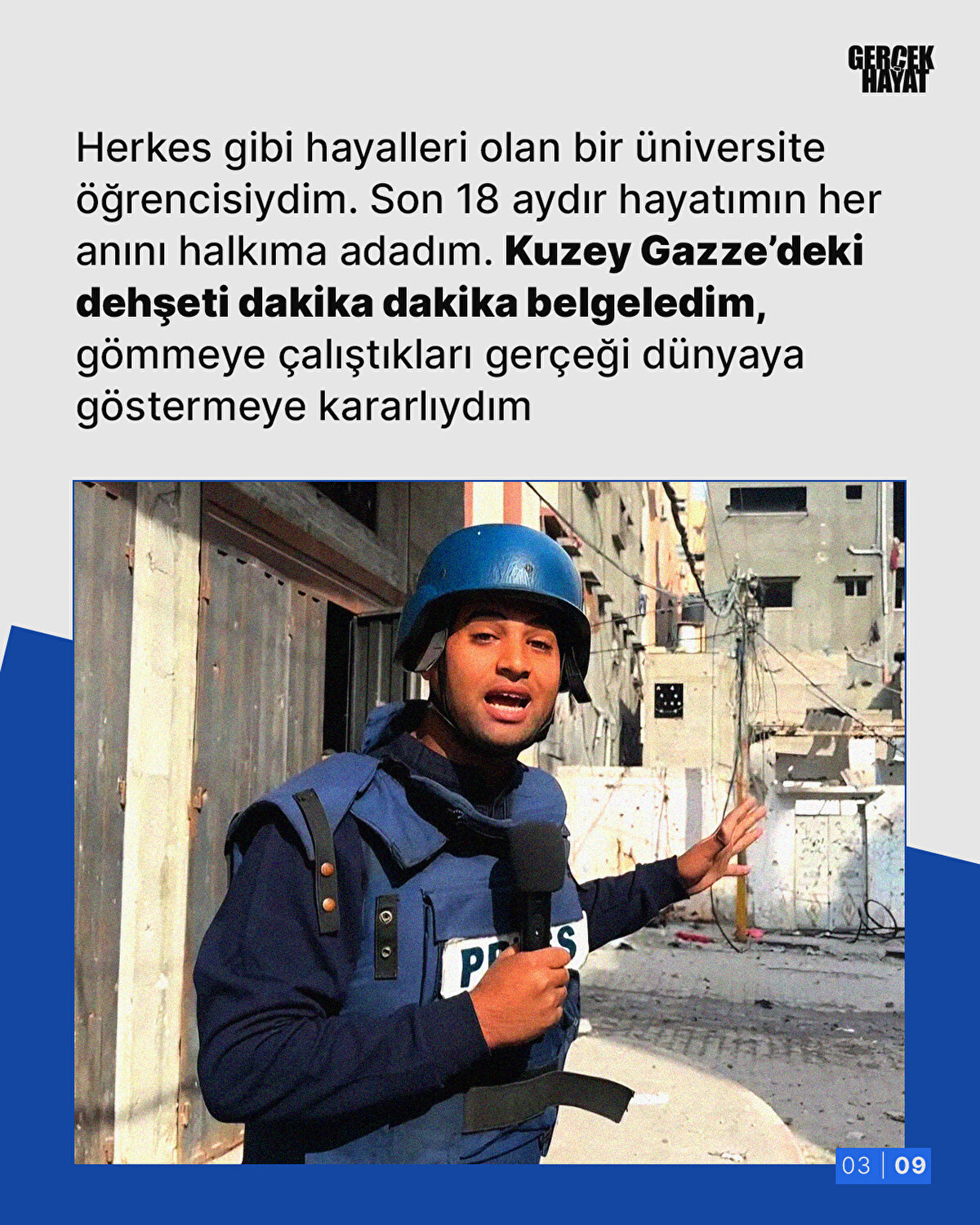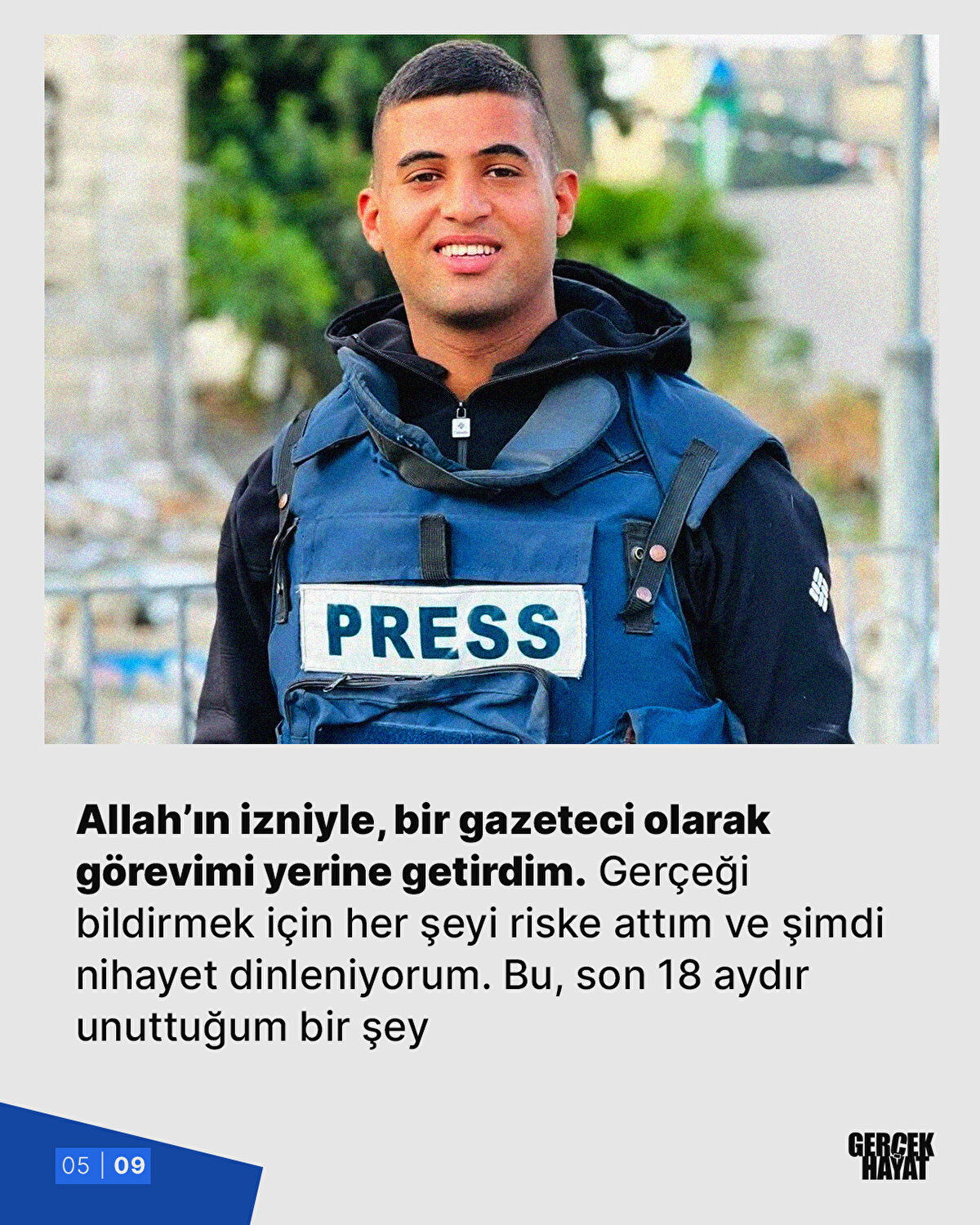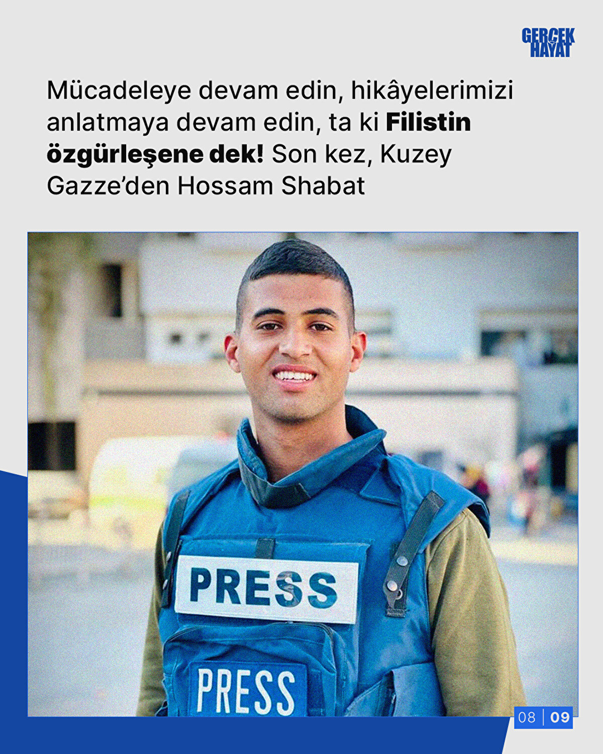 Bu satırlar binlerce haberi Gazze'den dünyaya duyuran gazeteci Hossam Shabat'ın şehid olduktan sonra yayınlanmak üzere bıraktığı vasiyeti. Husam, 24 Mart'ta işgal güçlerinin aracını doğrudan hedef alması sonucu 23 yaşında şehid oldu. El Cezire Mubaşer için çalışan Hossam, soykırımın başından bu yana Kuzey Gazze'deydi.