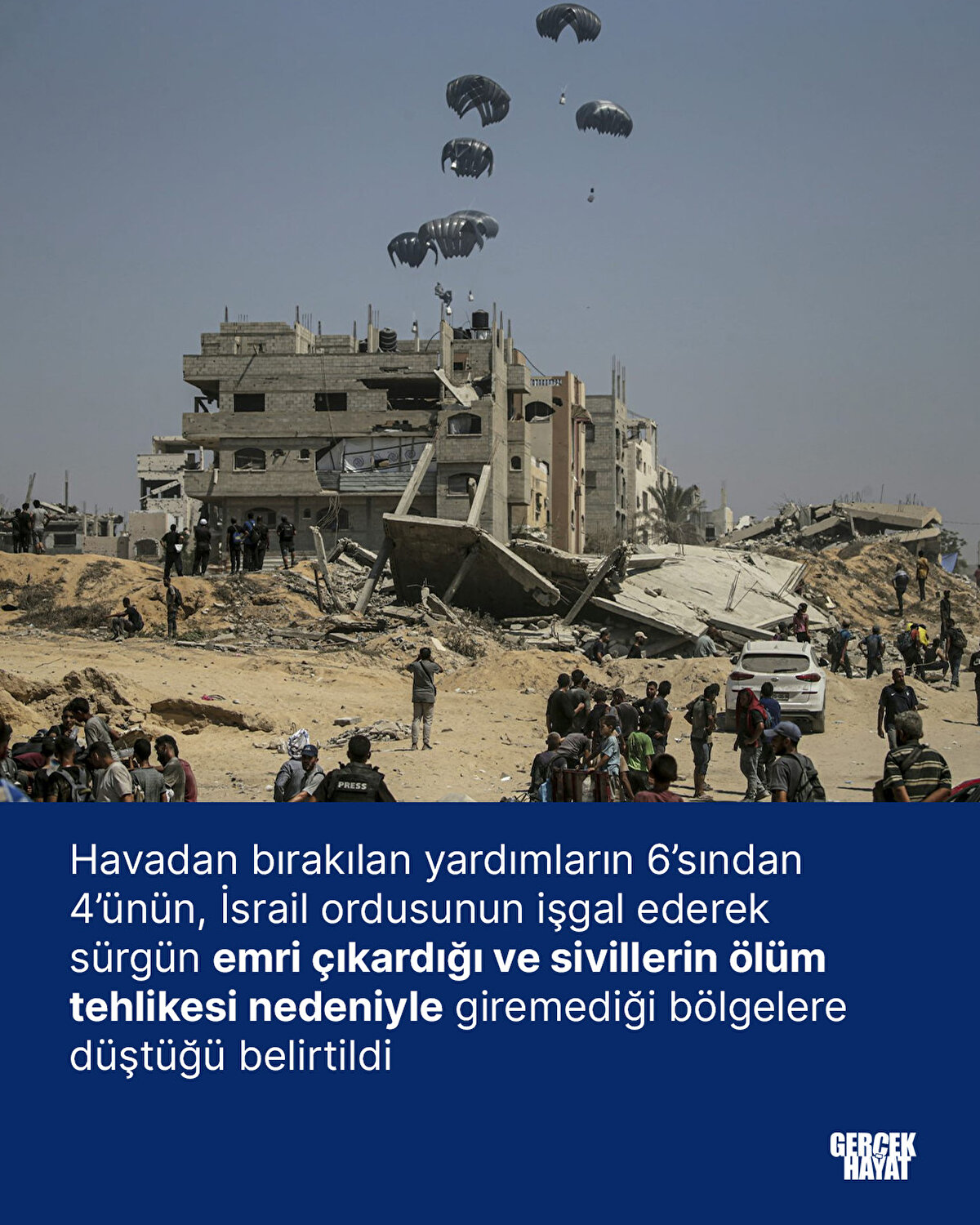 Havadan bırakılan yardımların 6'sından 4'ünün, İsrail ordusunun işgal ederek sürgün emri çıkardığı ve sivillerin ölüm tehlikesi nedeniyle giremediği bölgelere düştüğü belirtildi.