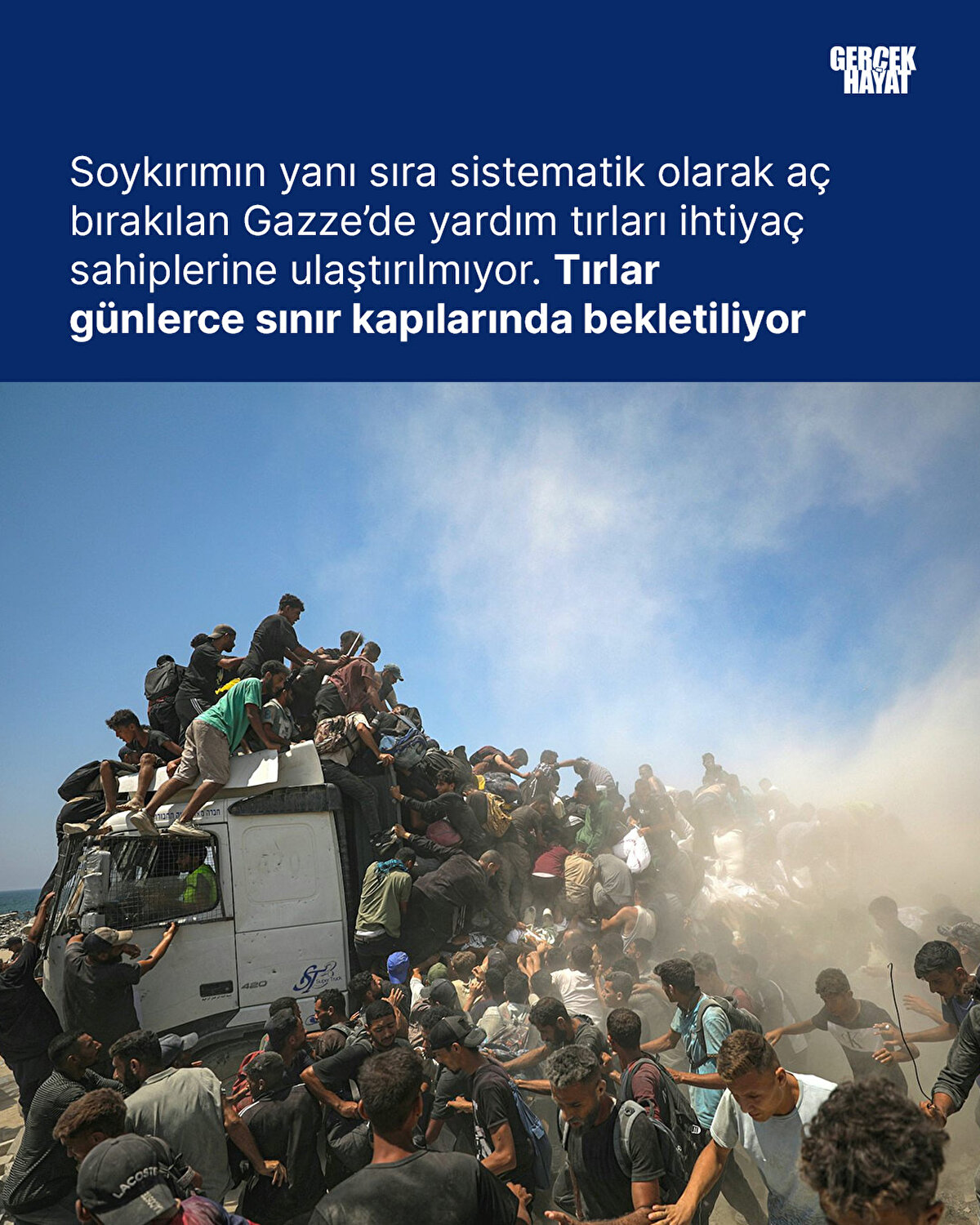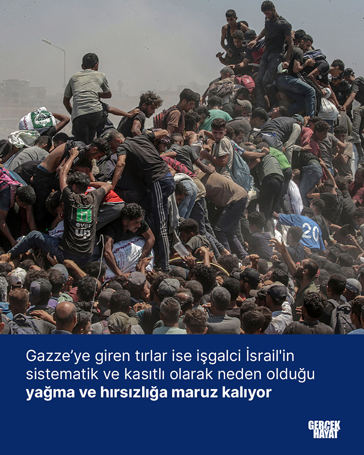 Soykırımın yanı sıra sistematik olarak aç bırakılan Gazze'de yardım tırları ihtiyaç sahiplerine ulaştırılmıyor. Tırlar günlerce sınır kapılarında bekletiliyor.Gazze'ye giren tırlar ise işgalci İsrail'in sistematik ve kasıtlı olarak neden olduğu yağma ve hırsızlığa maruz kalıyor.