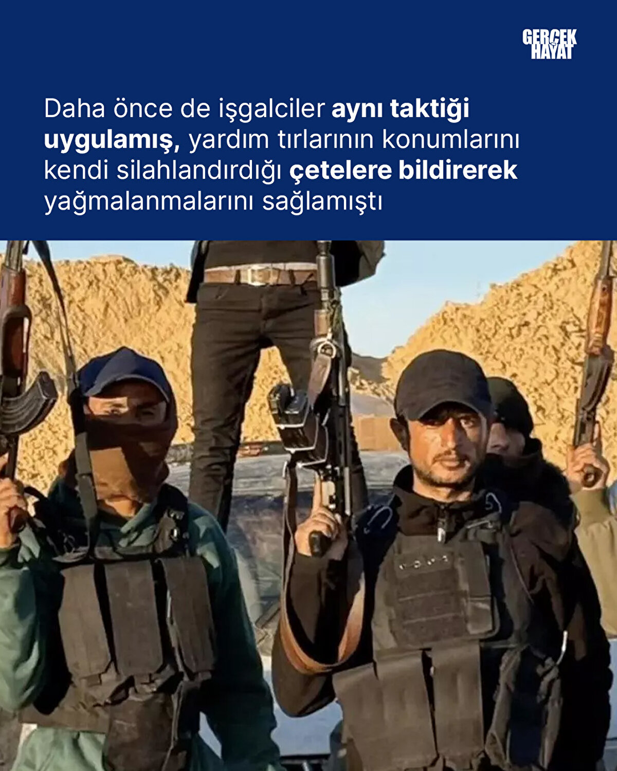 Daha önce de işgalciler aynı taktiği uygulamış, yardım tırlarının konumlarını kendi silahlandırdığı çetelere bildirerek yağmalanmalarını sağlamıştı.