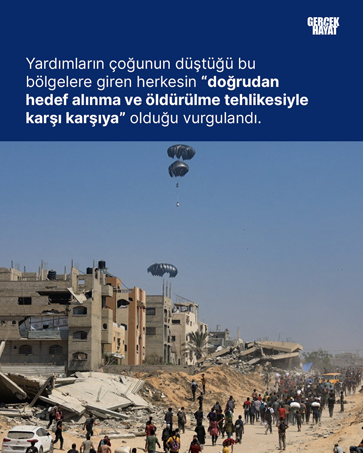 Yardımların çoğunun düştüğü bu bölgelere giren herkesin “doğrudan hedef alınma ve öldürülme tehlikesiyle karşı karşıya” olduğu vurgulandı.