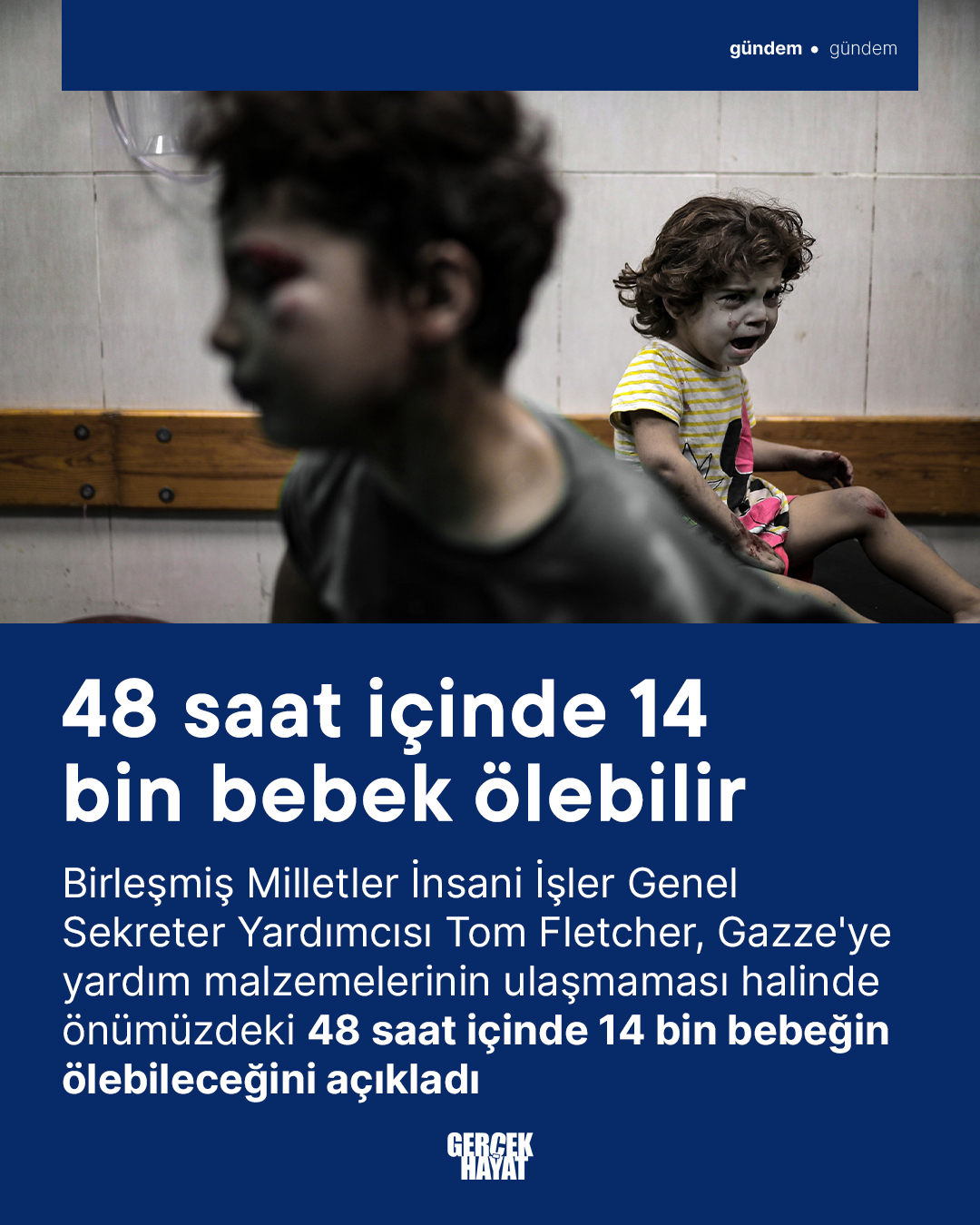 48 saat içinde 14 bin bebek ölebilir Birleşmiş Milletler İnsani İşler Genel Sekreter Yardımcısı Tom Fletcher, Gazze'ye yardım malzemelerinin ulaşmaması halinde önümüzdeki 48 saat içinde 14 bin bebeğin ölebileceğini açıkladı