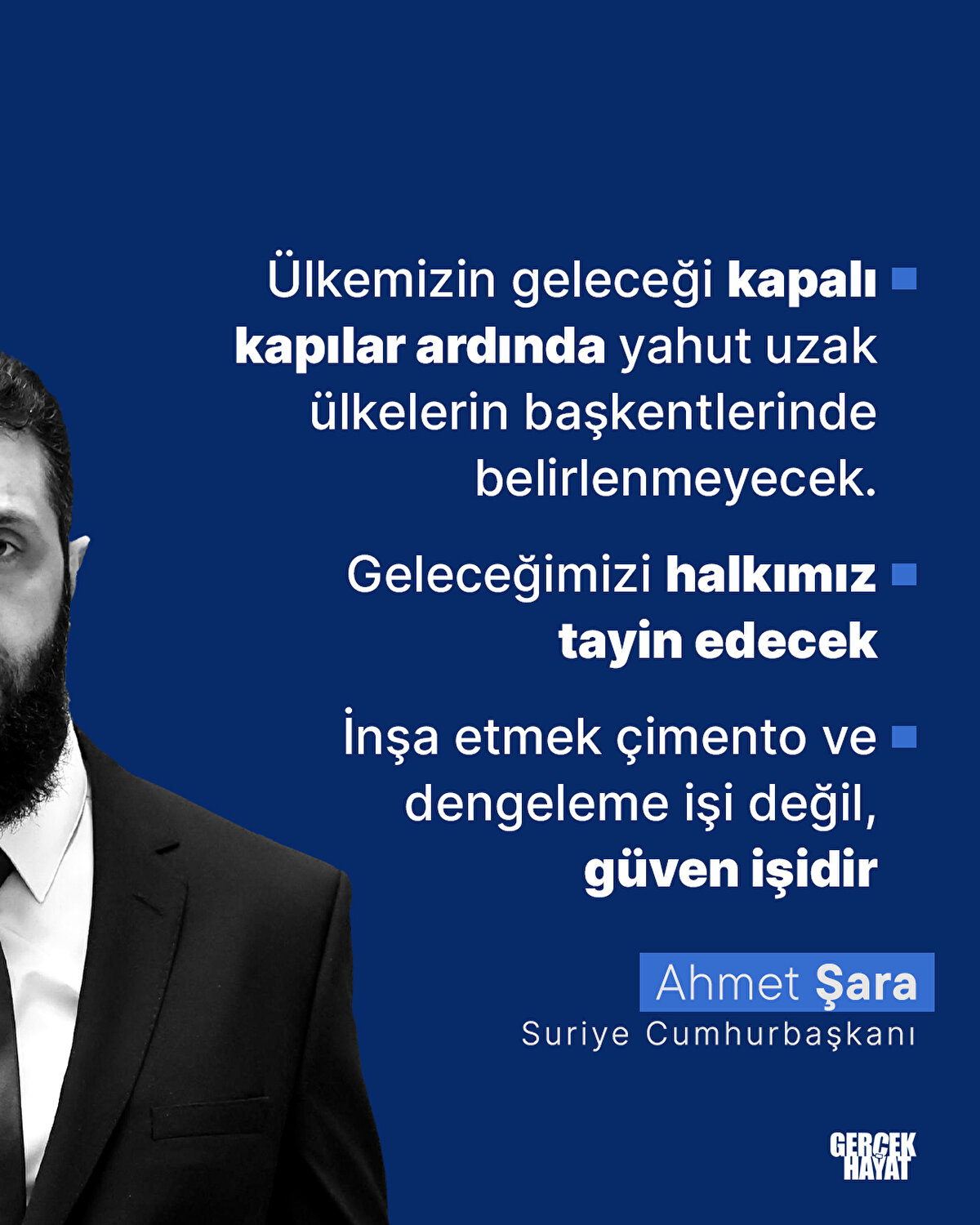 Suriye Cumhurbaşkanı Ahmed Şara, göreve gelmesinin ardından Avrupa'ya düzenlediği ilk resmi ziyarette, Fransa Cumhurbaşkanı Emmanuel Macron ile bir araya geldi. Macron'un Suriye'nin yeniden inşasına destek teklifine teşekkür eden Şara, 'Ülkemizin geleceği kapalı kapılar ardında yahut uzak ülkelerin başkentlerinde belirlenmeyecek. Geleceğimizi halkımız tayin edecek. İnşa etmek çimento ve dengeleme işi değil, güven işidir' ifadelerini kullandı.
