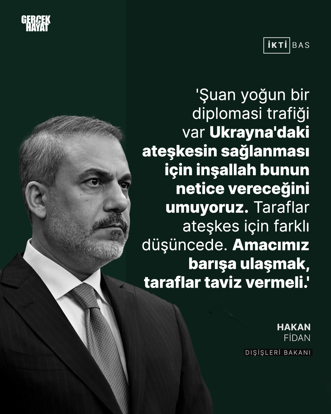 Türkiye'nin ev sahipliğinde Antalya'da düzenlenen NATO Dışişleri Bakanları Gayriresmi Toplantısı'nın ardından basın toplantısı düzenleyen Dışişleri Bakanı Hakan Fidan, 'Şuan yoğun bir diplomasi trafiği var Ukrayna'daki ateşkesin sağlanması için inşallah bunun netice vereceğini umuyoruz. Taraflar ateşkes için farklı düşüncede. Amacımız barışa ulaşmak, taraflar taviz vermeli.' dedi.