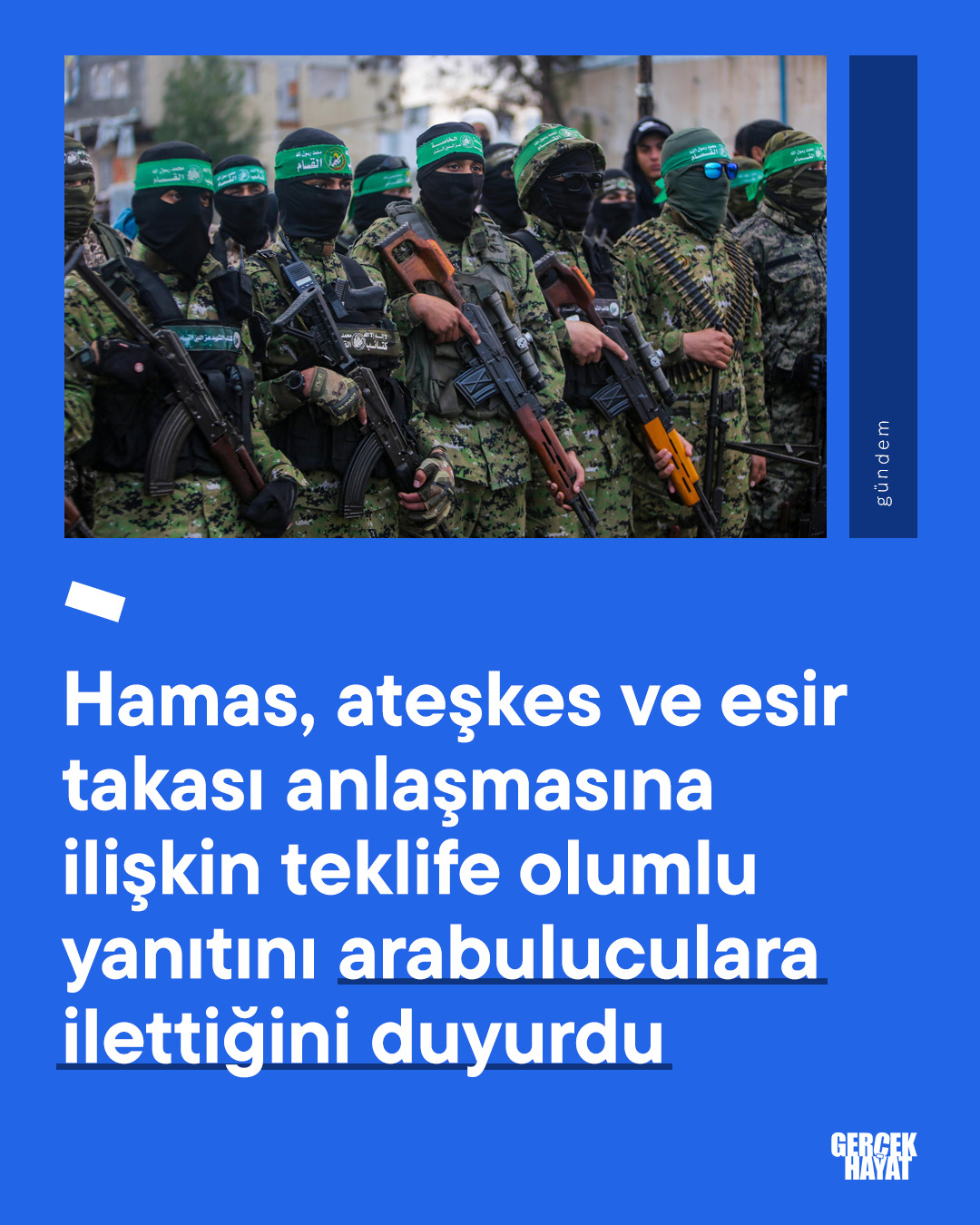 Hamas'tan yapılan yazılı açıklamada, Gazze'de İsrail ile ateşkes ve esir takasına ilişkin teklife, Filistinli siyasi gruplarla istişare sonucunda verilen "olumlu yanıtın" arabuluculara iletildiği belirtildi.