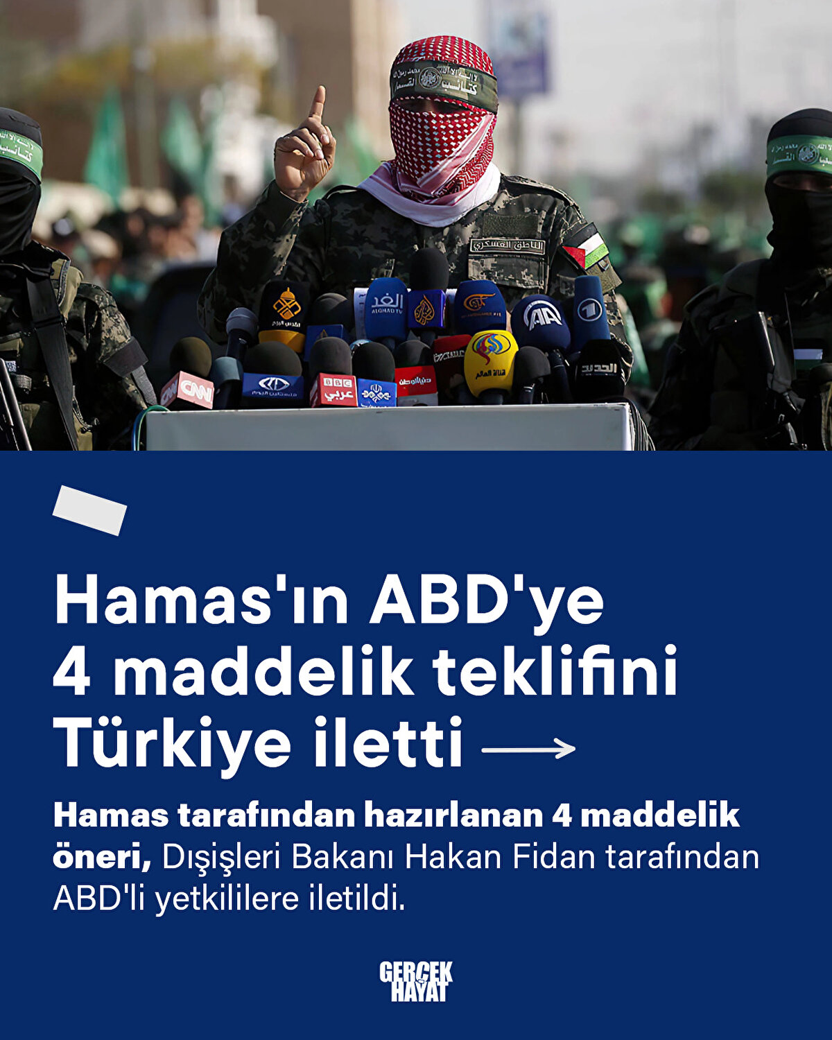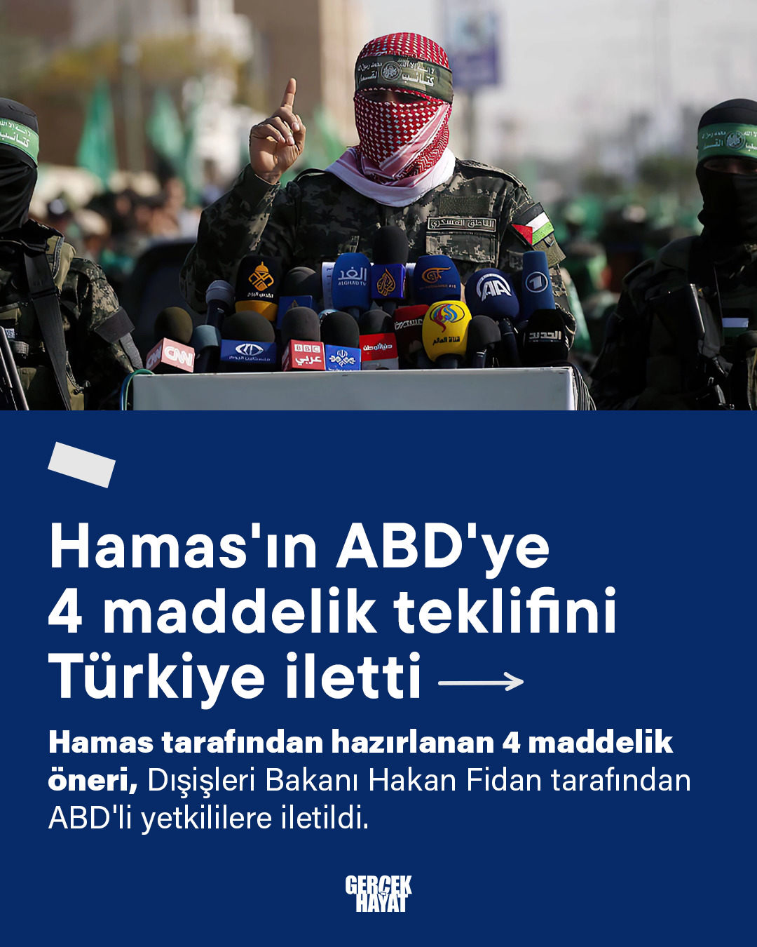 Hamas tarafından hazırlanan 4 maddelik öneri, Dışişleri Bakanı Hakan Fidan tarafından ABD'li yetkililere iletildi.
