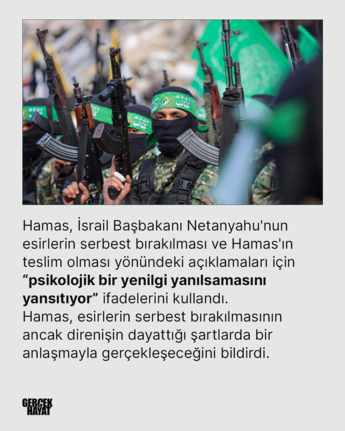 Hamas, İsrail Başbakanı Netanyahu'nun esirlerin serbest bırakılması ve Hamas'ın teslim olması yönündeki açıklamaları için “psikolojik bir yenilgi yanılsamasını yansıtıyor" ifadelerini kullandı.