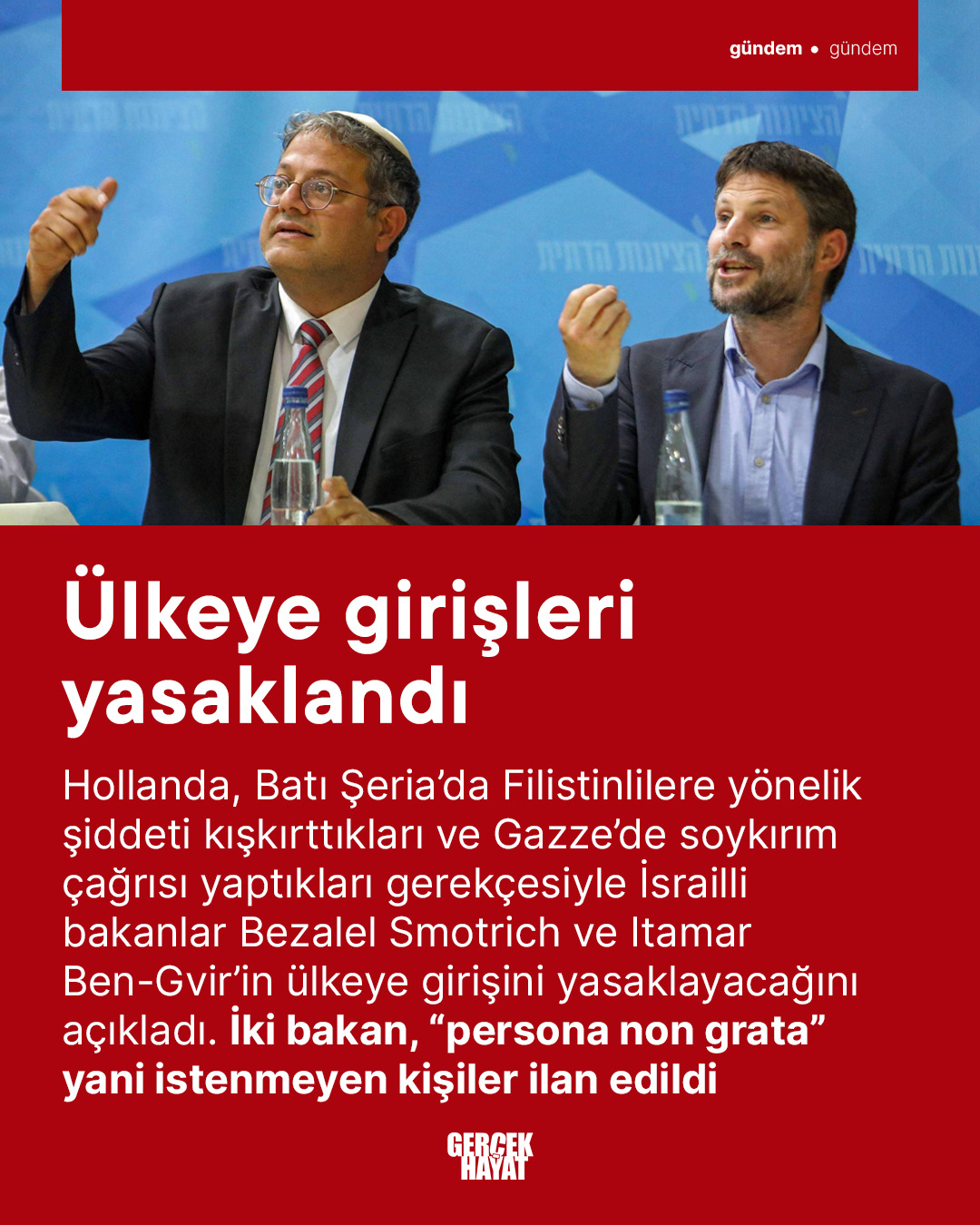 Hollanda hükümeti, Batı Şeria'da Filistinlilere yönelik şiddeti provoke ettikleri ve Gazze'de “soykırım” çağrısında bulundukları gerekçesiyle İsrail Maliye Bakanı Bezalel Smotrich ve Ulusal Güvenlik Bakanı Itamar Ben‑Gvir'in ülkeye girişini yasaklama kararı aldı. Ayrıca İsrail'in Hollanda'daki büyükelçisi resmi olarak dışişleri bakanlığına çağrıldı. Yerel basında çıkan haberlere göre bu iki bakan, "persona non grata" yani istenmeyen kişiler ilan edildi.Hollanda Dışişleri Bakanı Caspar Veldkamp, Parlamento'ya hitaben yazdığı mektupta, Smotrich ve Ben‑Gvir'in Filistinlilere karşı şiddeti defalarca kışkırttıklarını; yerleşim yerlerinin genişletilmesini savunduklarını ve Gazze'de açıkça "soykırım" çağrısı yaptıklarını belirtti. Ayrıca bu aşırı söylemlerin, yerleşimci saldırılarını artırdığı ve uluslararası barış çabalarını baltaladığı vurgulandı.Bu adım, İngiltere, Kanada, Avustralya, Yeni Zelanda ve Norveç gibi ülkelerin de benzer yaptırım kararlarıyla birlikte yürütülen uluslararası tepkinin bir parçası. Hollanda, ayrıca AB'nin İsrail'e yönelik araştırma fonlarına erişimini sınırlama önerisini desteklediğini ve gerektiğinde ticari yaptırımlara gidebileceğini açıkladı.