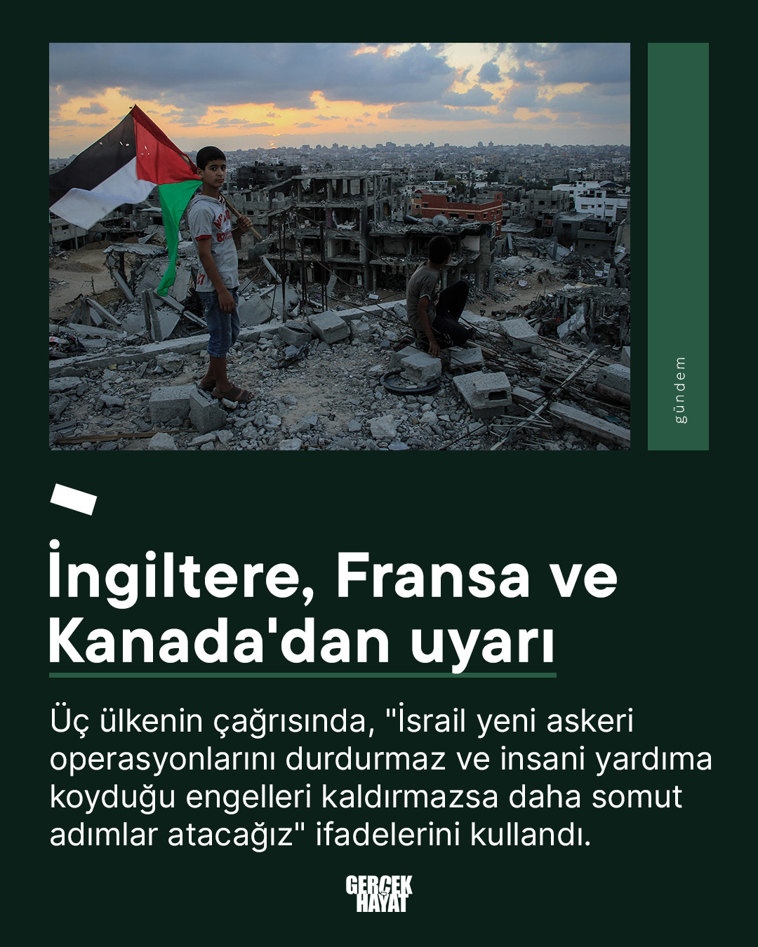 İngiltere, Fransa ve Kanada'dan İsrail'e sert uyarı: 'Engelleri kaldırmazsa bunlara karşı daha somut adımlar atacağız' İngiltere, Fransa ve Kanada yaptıkları ortak açıklamada, İsrail'in Gazze'deki saldırılarını genişletme kararı kınandı. İsrail hükümet yetkililerinin Gazze'deki insanları yerinden etme yönünde kullandığı ifadelerle ilgili, "İsrail hükümeti üyelerinin kullandığı nefret dilini kınıyoruz" denildi.