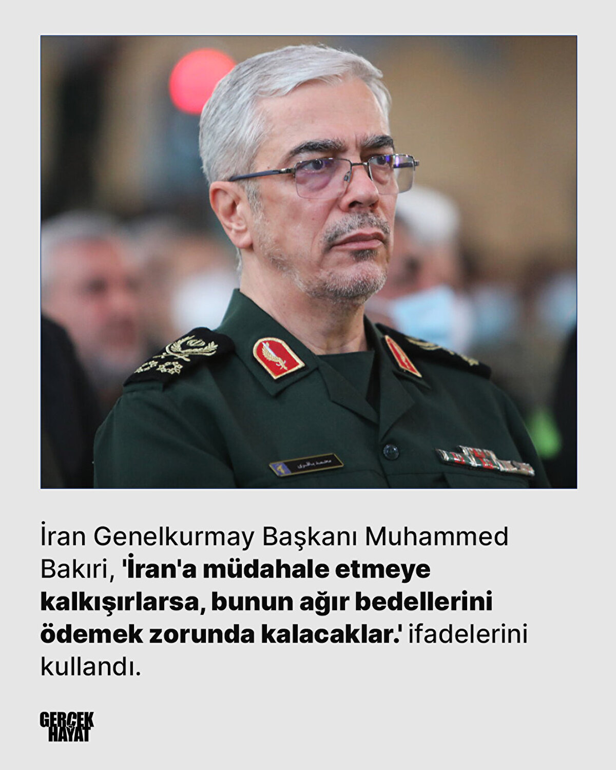 İran Genelkurmay Başkanı Muhammed Bakıri, 'İran'a müdahale etmeye kalkışırlarsa, bunun ağır bedellerini ödemek zorunda kalacaklar.' ifadelerini kullandı. Batı medyasında dün, ABD'li yetkililere dayandırılan haberde, İsrail'in İran'a yönelik bir saldırıya hazırlandığı iddia edilmişti. ABD'li yetkilinin, "İsrail'in, İran'ın nükleer tesislerine bir saldırı düzenleme ihtimali büyük ölçüde arttı." ifadelerine yer verilmiş, ABD'nin İran'ın uranyum zenginleştirmesine olanak tanıması durumunda İsrail'in saldırı olasılığının daha mümkün hale geldiği ileri sürülmüştü.