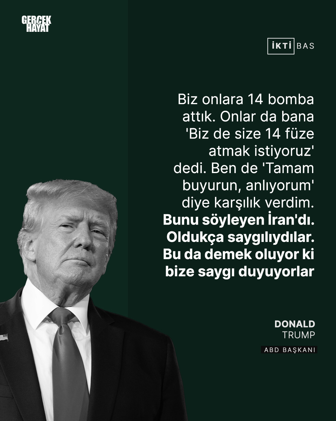 Iowa eyaletinin Des Moines kentinde düzenlenen bir etkinlikte konuşan Trump, ABD'nin İran'daki nükleer tesisleri hedef alan saldırılarından sonra Tahran'ın verdiği karşılığa ilişkin açıklamalarda bulundu. Trump, İran'ın Katar'da bulunan El-Udeyd Hava Üssü'ne saldırı düzenlemeden önce kendisine haber verdiğini ifade ederek, "Beni aradılar ve 'Size saldırı düzenlememiz gerek' dediler. Bunu söyleyen İran'dı. Oldukça saygılıydılar. Bu da demek oluyor ki bize saygı duyuyorlar." dedi. ABD Başkanı Trump, "Biz onlara 14 bomba attık. Onlar da bana 'Biz de size 14 füze atmak istiyoruz' dedi. Ben de 'Tamam buyurun, anlıyorum' diye karşılık verdim." şeklinde konuştu. İran'ın saldırının saatini ve hedeflerini de önceden bildirdiğini vurgulayan Trump, "Saldırıyı nereye düzenleyeceklerini söylediler. Ben de 'güzel' dedim. Üssü tahliye ettik. Bana 'Efendim saldırı saat birde' dediler. Ben de bunun sorun olmayacağını söyledim." ifadelerini kullandı