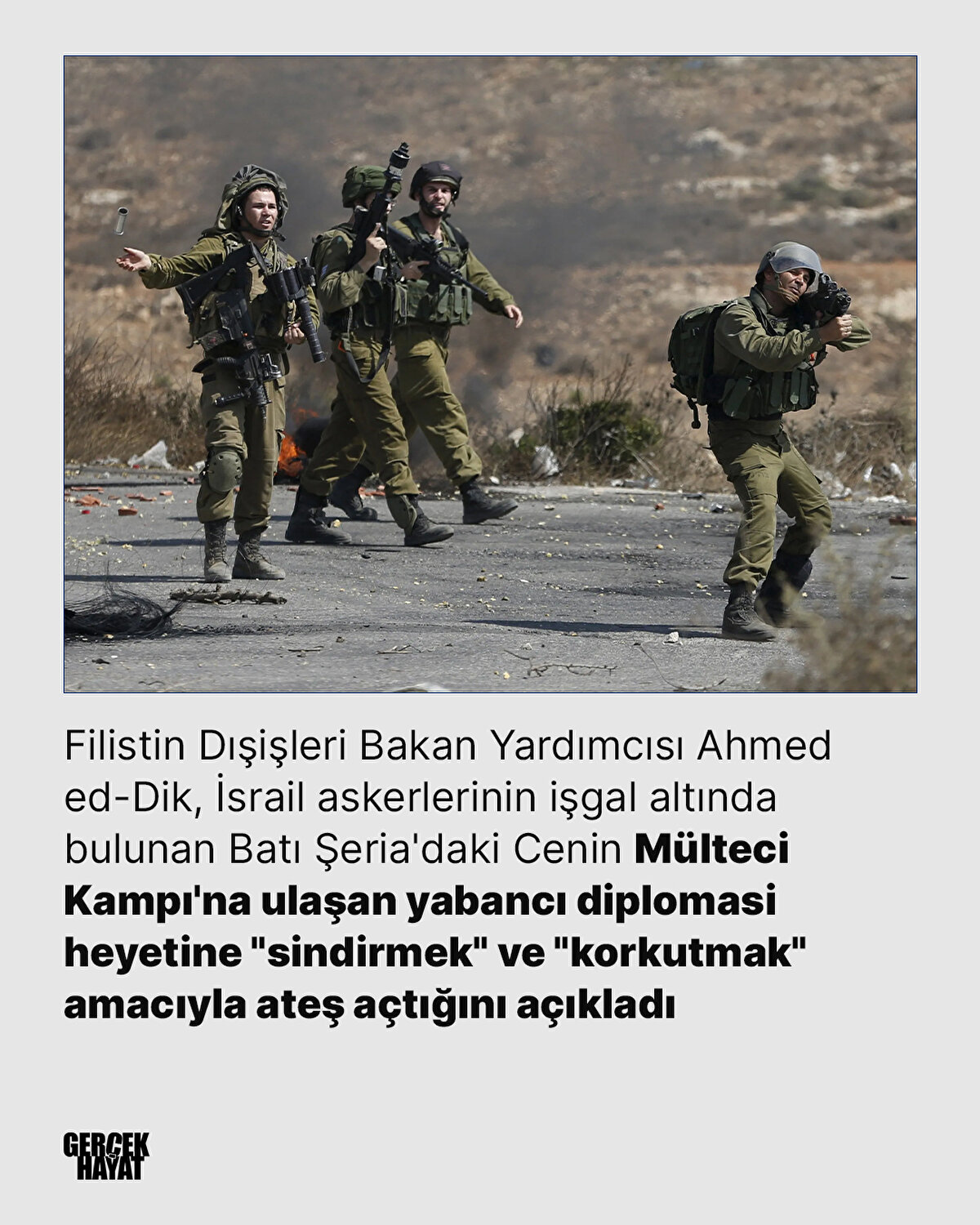 Filistin Dışişleri Bakan Yardımcısı Dik, Anadolu Ajansı (AA) muhabirine yaptığı açıklamada, "İsrail işgal güçleri, 35 büyükelçi, konsolos ve diplomattan oluşan diplomatik heyetin kampın girişine varması üzerine kuralları ihlal ederek gerçek mermiyle ateş açtı." dedi.Heyete eşlik eden Dik, askerlerin heyeti "korkutmak ve sindirmek" ve heyetin 21 Ocak'tan bu yana kuşatma altında olan kampa girmelerini engellemek amacıyla ateş açtığını belirtti.Dik, İsrail'in ateş açmasını kınayarak, "Batı Şeria ve Gazze Şeridi'nde Filistinlilere yönelik İsrail saldırılarının sona ermesi ve İsrail'in hesap vermesi" çağrısında bulundu.İsrail ordusunun ateş açtığı heyette Türkiye'nin Filistin nezdindeki Kudüs Başkonsolosluğu'ndan diplomatların da yer aldığı belirtildi.