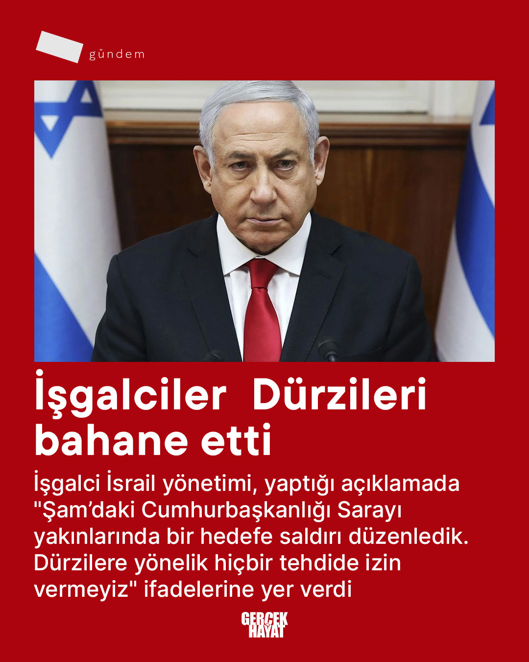 İşgalci İsrail yönetimi, yaptığı açıklamada "Şam'daki Cumhurbaşkanlığı Sarayı yakınlarında bir hedefe saldırı düzenledik. Dürzilere yönelik hiçbir tehdide izin vermeyiz" ifadelerine yer verdi