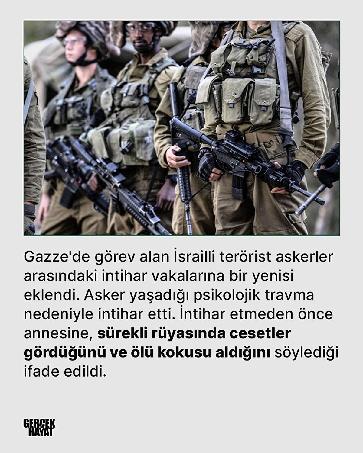 Gazze'de görev alan İsrailli terörist askerler arasındaki intihar vakalarına bir yenisi eklendi. Asker, yaşadığı psikolojik travma nedeniyle intihar etti. İntihar etmeden önce annesine, sürekli rüyasında cesetler gördüğünü ve ölü kokusu aldığını söylediği ifade edildi.