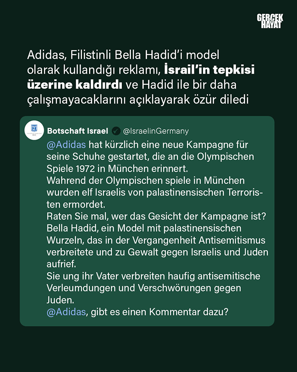 Adidas, Filistinli Bella Hadid'i reklam yüzü yaptığı için İsrail'in Almanya Büyükelçiliği hesabından linç edildi. Siyonist efendilerinden özür dileyen Adidas, reklamı kaldırdı