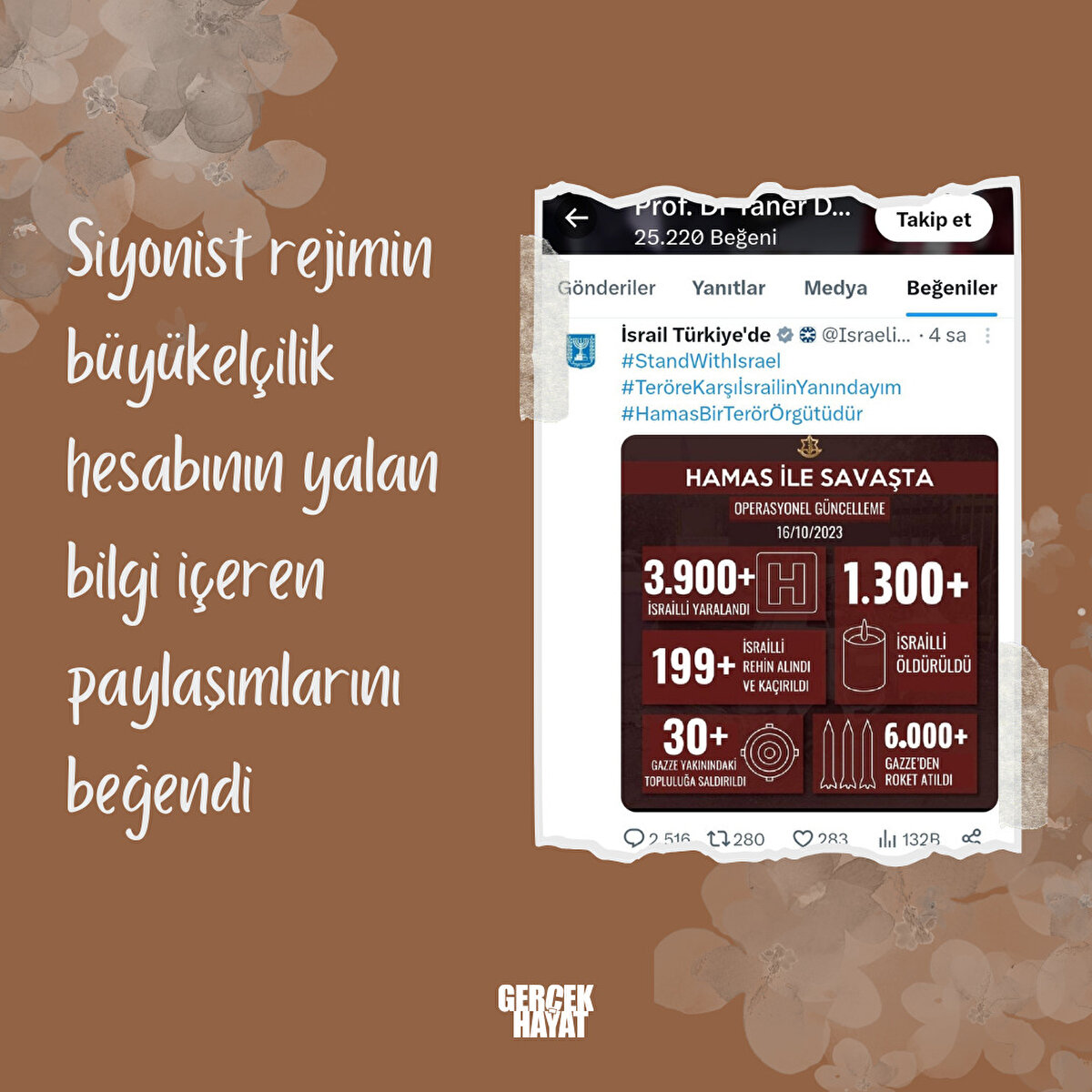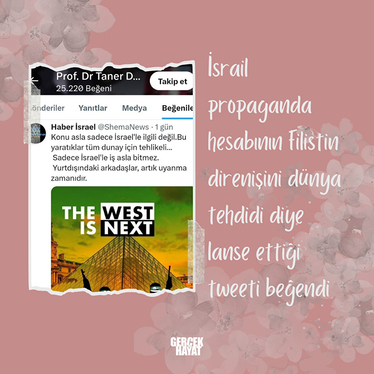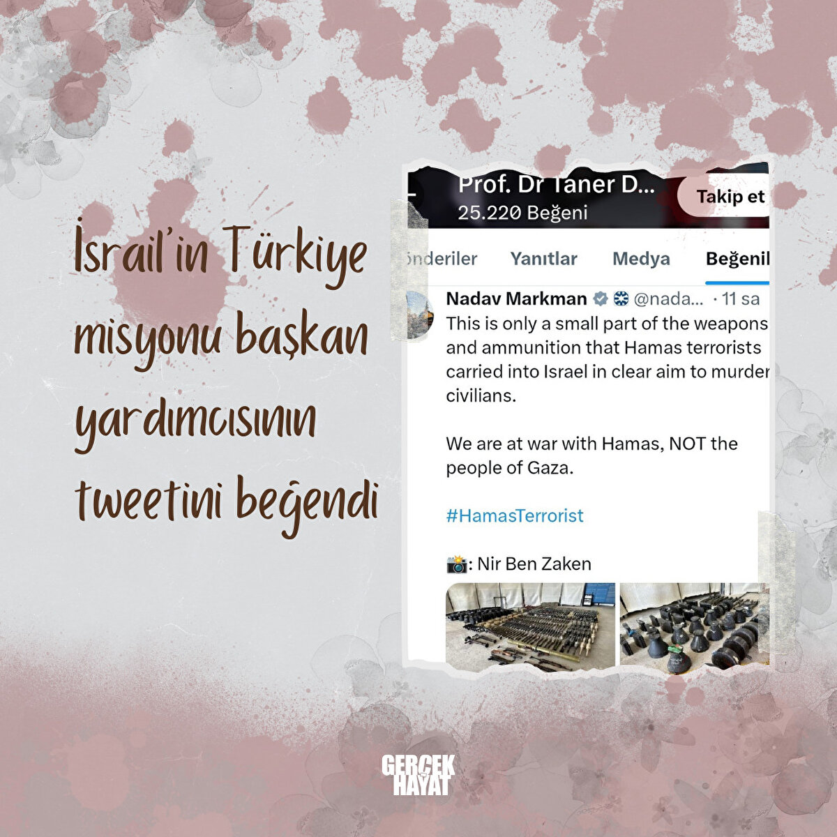 İYİ Parti Genel Başkanı Meral Akşener, "Eğer gerçekten samimiyseniz Netanyahu'ya gösterdiğiniz tavır kadın ve çocuk demeden acımasızca öldüren Hamas'a da gösterilmelidir" dedi. Geçtiğimiz günlerde İYİ Parti Genel Başkan Yardımcısı Taner Demirer'in İsrail propagandası içeren tweetleri beğendiği ortaya çıkmıştı.