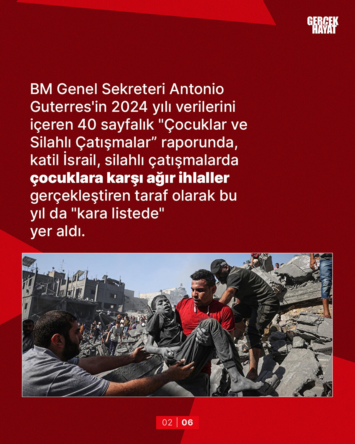 BM Genel Sekreteri Antonio Guterres'in 2024 yılı verilerini içeren 40 sayfalık "Çocuklar ve Silahlı Çatışmalar” raporunda, katil İsrail, silahlı çatışmalarda çocuklara karşı ağır ihlaller gerçekleştiren taraf olarak bu yıl da "kara listede" yer aldı.