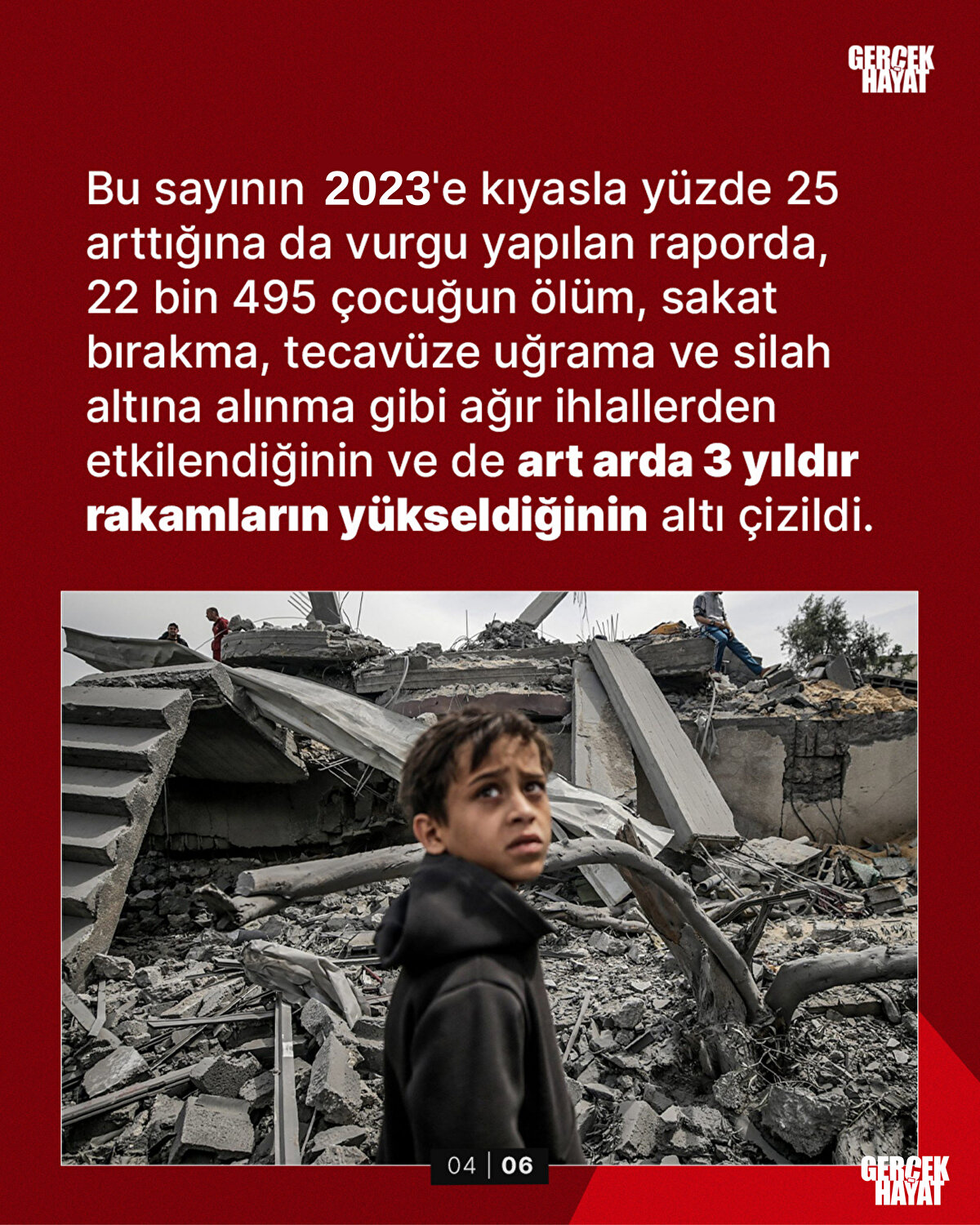 Bu sayının 2024'e kıyasla yüzde 25 arttığına da vurgu yapılan raporda, 22 bin 495 çocuğun ölüm, sakat bırakma, tecavüze uğrama ve silah altına alınma gibi ağır ihlallerden etkilendiğinin ve de art arda 3 yıldır rakamların yükseldiğinin altı çizildi.