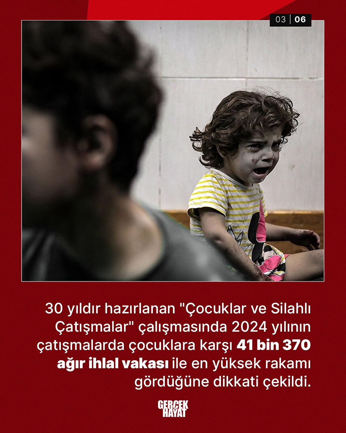 30 yıldır hazırlanan "Çocuklar ve Silahlı Çatışmalar" çalışmasında 2024 yılının çatışmalarda çocuklara karşı 41 bin 370 ağır ihlal vakası ile en yüksek rakamı gördüğüne dikkati çekildi.