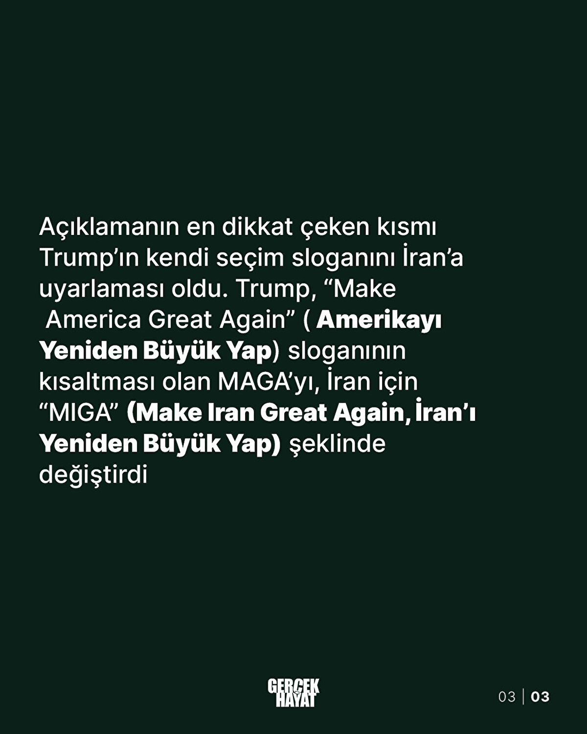 Açıklamanın en dikkat çeken kısmı Trump'ın kendi seçim sloganını İran'a uyarlaması oldu. Trump, “Make America Great Again” ( Amerikayı Yeniden Büyük Yap) sloganının kısaltması olan MAGA'yı, İran için “MIGA” (Make Iran Great Again, İran'ı Yeniden Büyük Yap) şeklinde değiştirdi.