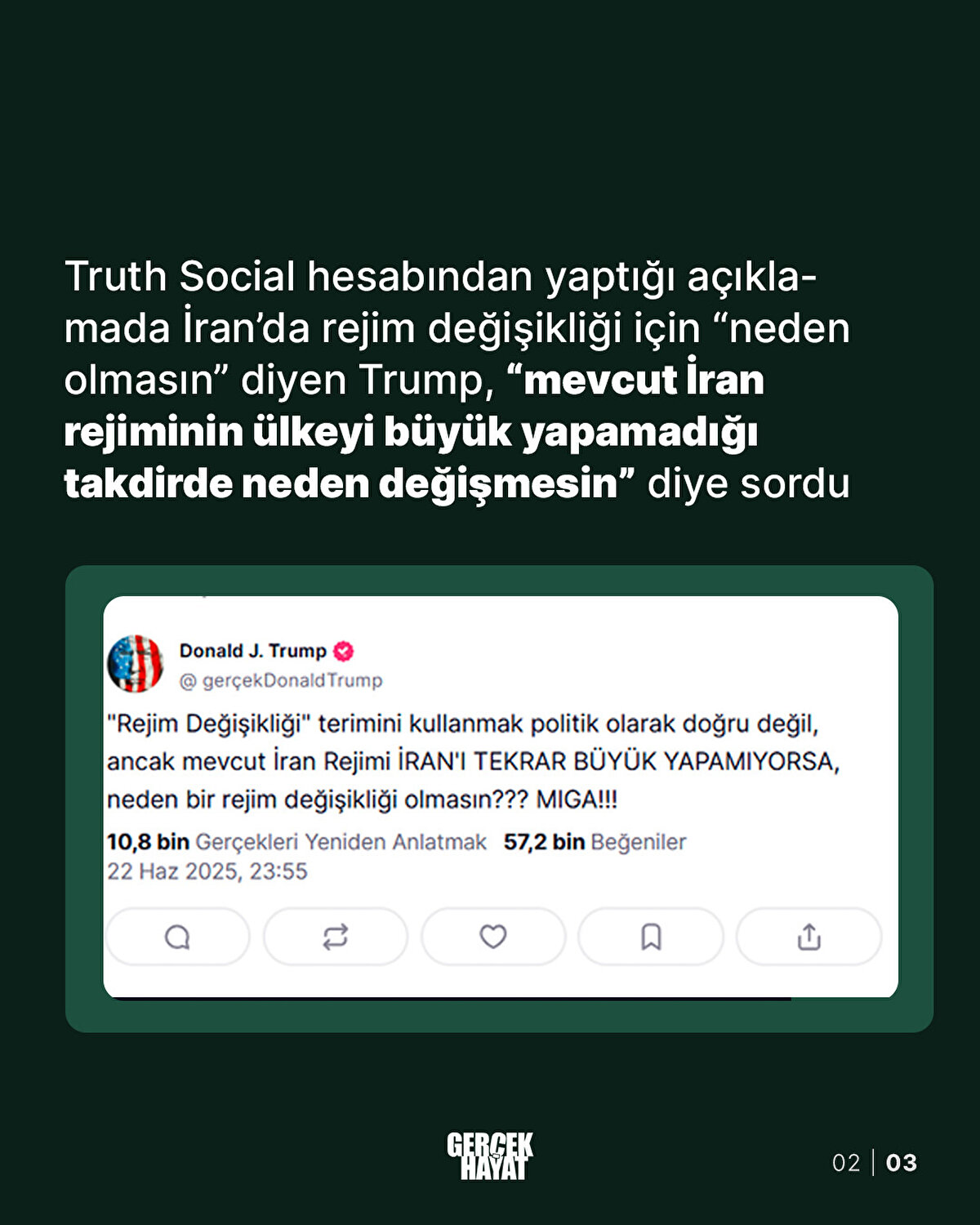 Truth Social hesabından yaptığı açıklamada İran'da rejim değişikliği için “neden olmasın” diyen Trump, “mevcut İran rejiminin ülkeyi büyük yapamadığı takdirde neden değişmesin” diye sordu