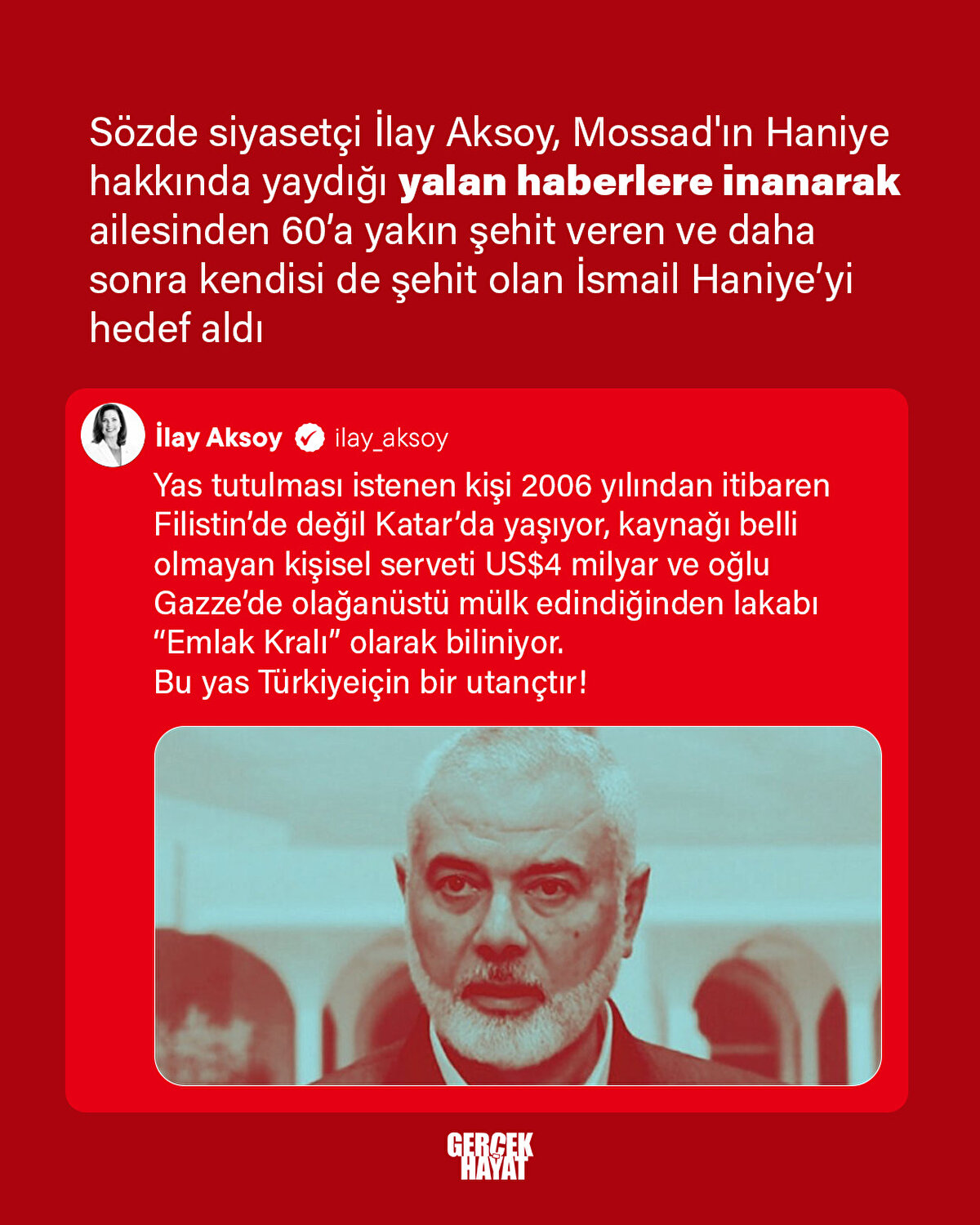 Siyasetçi olduğunu iddia eden İlay Aksoy, Mossad propagandasına sarılarak Haniye'ye iftira attı.