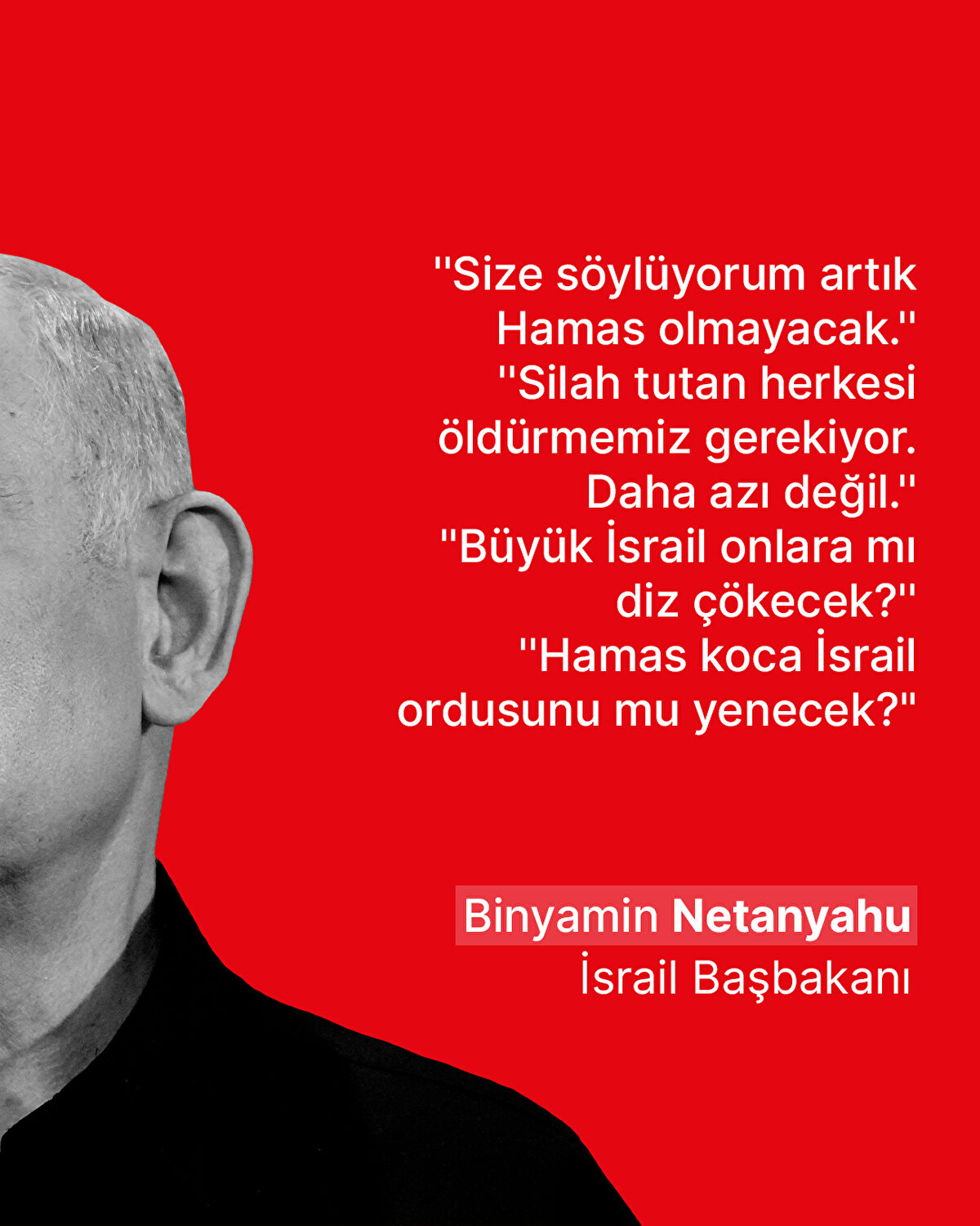 İsrail'de yayın yapan Kanal 13 televizyonunun haberine göre, Netanyahu, yaptığı açıklamada , "Silah tutan herkesi öldürmemiz gerekiyor. Daha azı değil. Büyük İsrail onlara mı diz çökecek? Hamas koca İsrail ordusunu mu yenecek?" dedi.