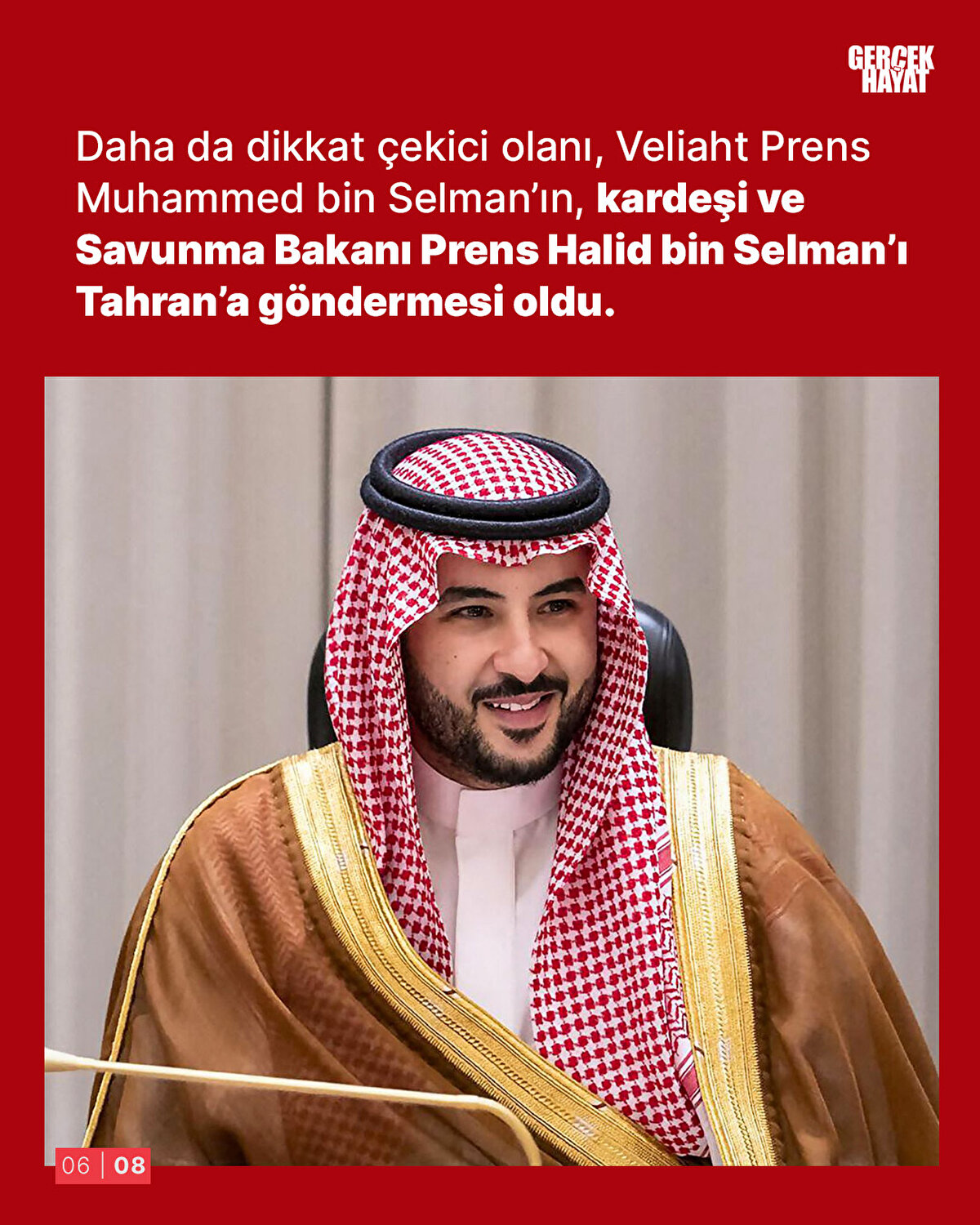 Daha da dikkat çekici olanı, Veliaht Prens Muhammed bin Selman'ın, kardeşi ve Savunma Bakanı Prens Halid bin Selman'ı Tahran'a göndermesi oldu.
