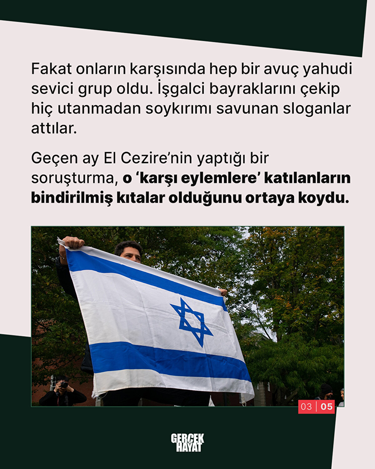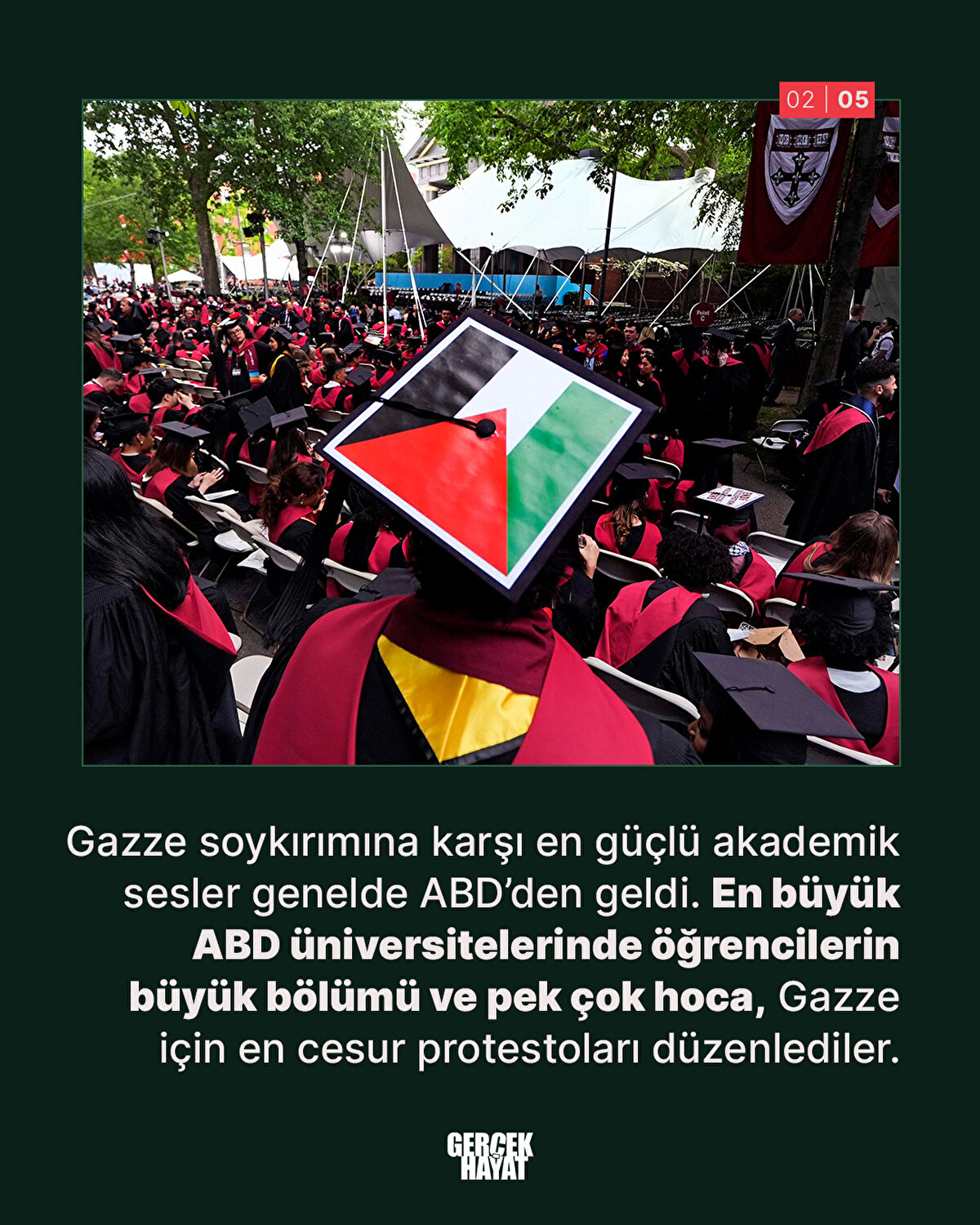 Gazze soykırımına karşı en güçlü akademik sesler genelde ABD'den geldi. En büyük ABD üniversitelerinde öğrencilerin büyük bölümü ve pek çok hoca, Gazze için en cesur protestoları düzenlediler. Fakat onların karşısında hep bir avuç yahudi sevici grup oldu. İşgalci bayraklarını çekip hiç utanmadan soykırımı savunan sloganlar attılar.