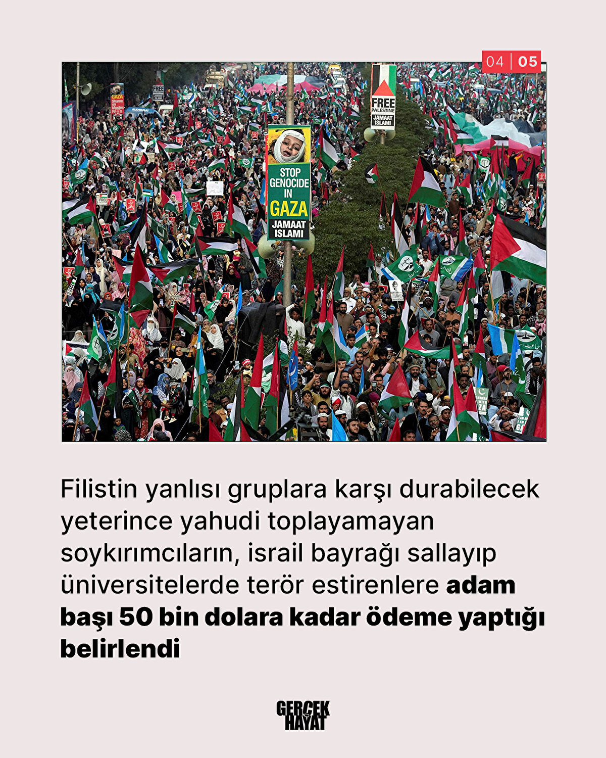 Filistin yanlısı gruplara karşı durabilecek yeterince yahudi toplayamayan soykırımcıların, israil bayrağı sallayıp üniversitelerde terör estirenlere adam başı 50 bin dolara kadar ödeme yaptığı belirlendi.
