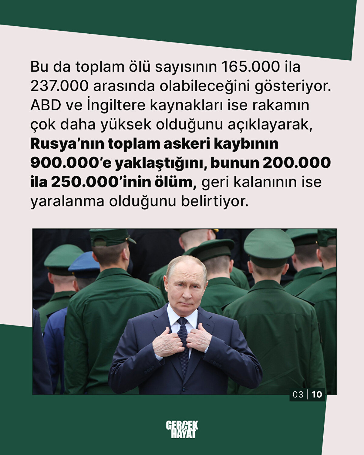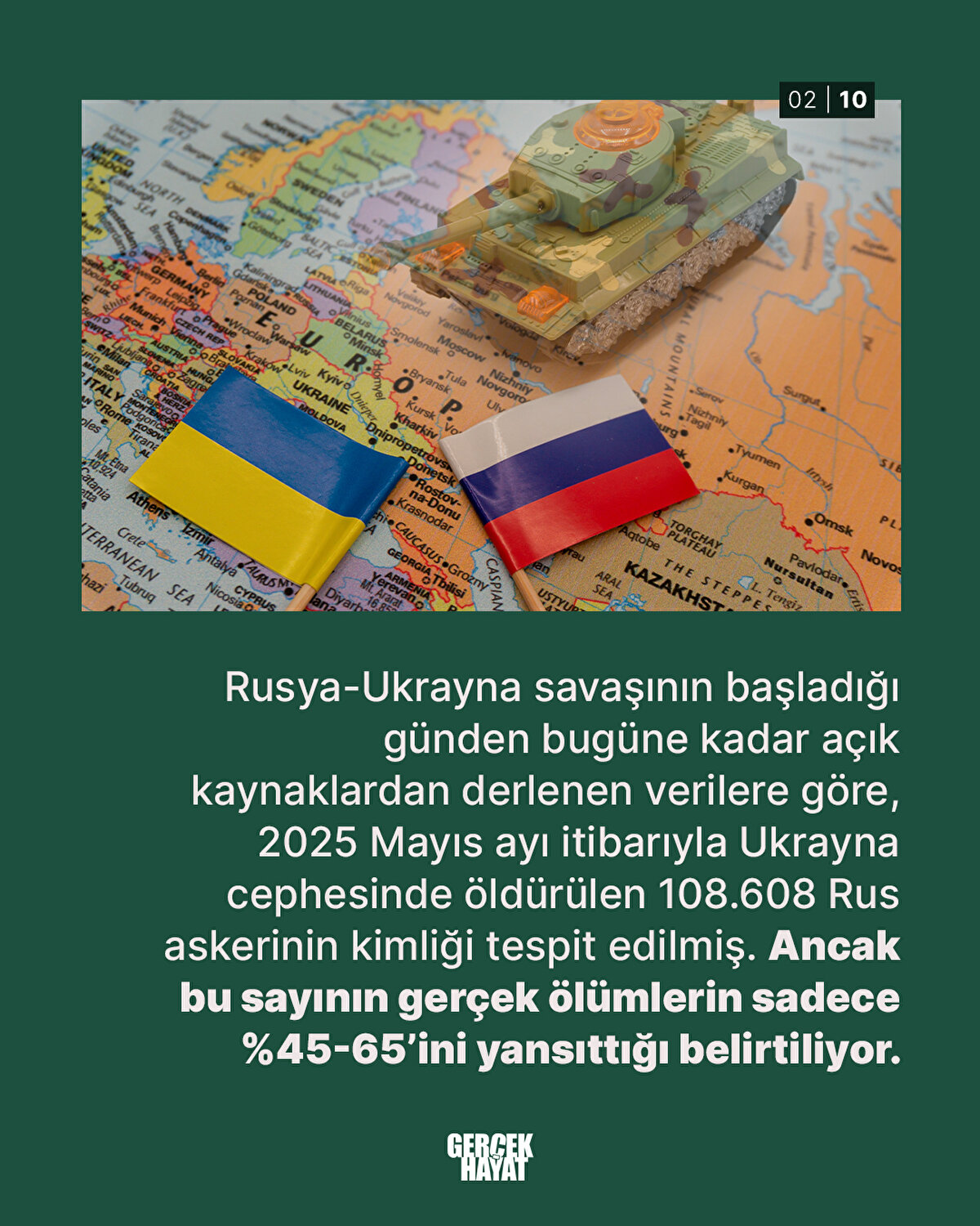Rusya-Ukrayna savaşının başladığı günden bugüne kadar açık kaynaklardan derlenen verilere göre, 2025 Mayıs ayı itibarıyla Ukrayna cephesinde öldürülen 108.608 Rus askerinin kimliği tespit edilmiş. Ancak bu sayının gerçek ölümlerin sadece %45-65'ini yansıttığı belirtiliyor. Bu da toplam ölü sayısının 165.000 ila 237.000 arasında olabileceğini gösteriyor. ABD ve İngiltere kaynakları ise rakamın çok daha yüksek olduğunu açıklayarak, Rusya'nın toplam askeri kaybının 900.000'e yaklaştığını, bunun 200.000 ila 250.000'inin ölüm, geri kalanının ise yaralanma olduğunu belirtiyor. Ukrayna Genelkurmay Başkanlığı ise Şubat 2025 itibarıyla Rusya'nın toplam kaybını 839.000 olarak duyurdu. Ukrayna cephesinde savaşacak asker bulmakta zorlanan Rusya'nın en son Kuzey Kore'den 10 bin askeri cepheye sürdüğünü, bununla birlikte birçok Afrika ülkesinden de paralı askerleri Ukrayna cephesine gönderdiği biliniyor. Kaynak: Gerçek Hayat Yazar Samir Babaoğlu