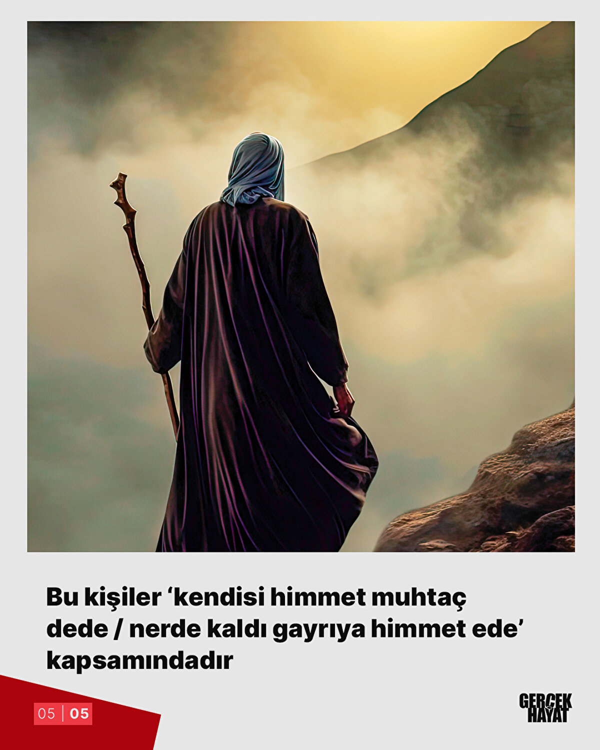 Şatafat içinde yaşayan, gıybet-dedikodu yapan, itikadında, amelinde problemler olan, her iktidara yamanmaya çalışan, güç sahiplerinden korkan, Hakk-bâtıl ayırmakta güçlük çeken, gariplerle değil zenginlerle beraber olmaya çalışan, ihale, adam atama peşinde koşan kişilerden bırakın keşf mücahedesi şeyhi olmak, takva mücahedesi kılavuzu bile olmaz. Bu kişiler 'kendisi himmet muhtaç dede / nerde kaldı gayrıya himmet ede' kapsamındadır.