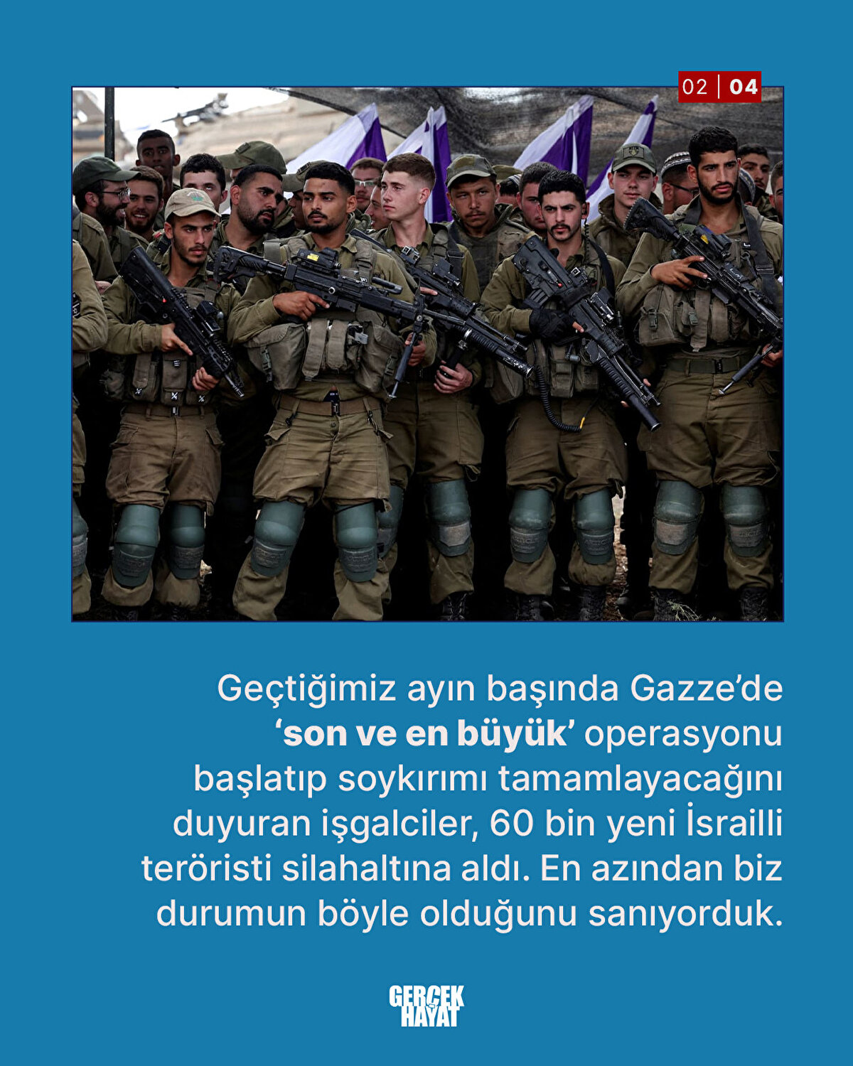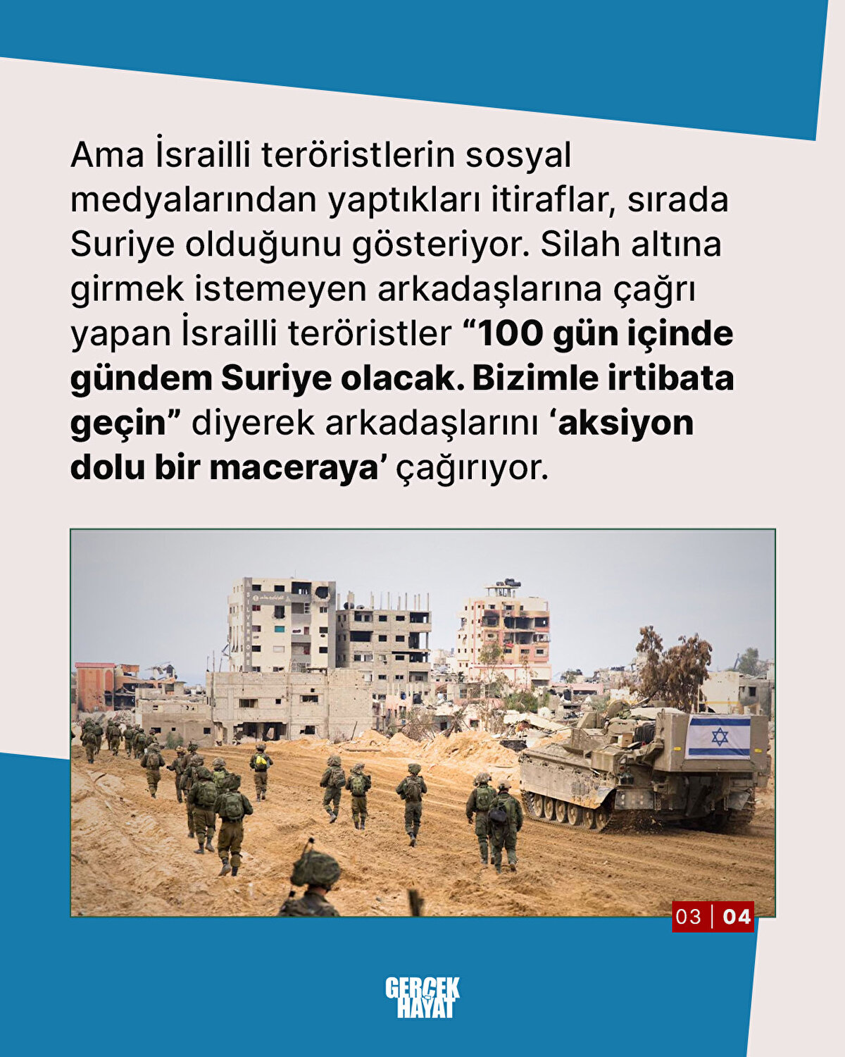 Geçtiğimiz ayın başında Gazze'de 'son ve en büyük' operasyonu başlatıp soykırımı tamamlayacağını duyuran işgalciler, 60 bin yeni yahudi teröristi silahaltına aldı. En azından biz durumun böyle olduğunu sanıyorduk. Ama yahudi teröristlerin sosyal medyalarından yaptıkları itiraflar, sırada Suriye olduğunu gösteriyor. Silahaltına girmek istemeyen arkadaşlarına çağrı yapan yahudi teröristler “100 gün içinde gündem Suriye olacak. Bizimle irtibata geçin” diyerek arkadaşlarını 'aksiyon dolu bir maceraya' çağırıyor.