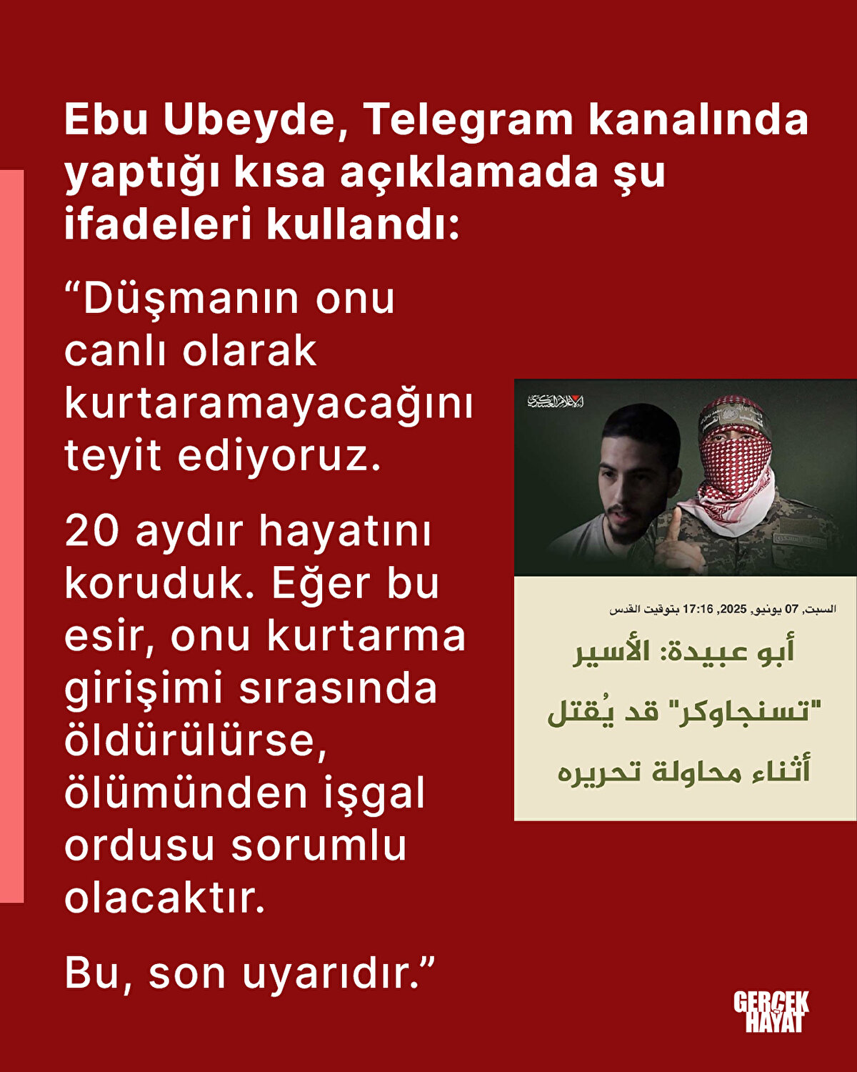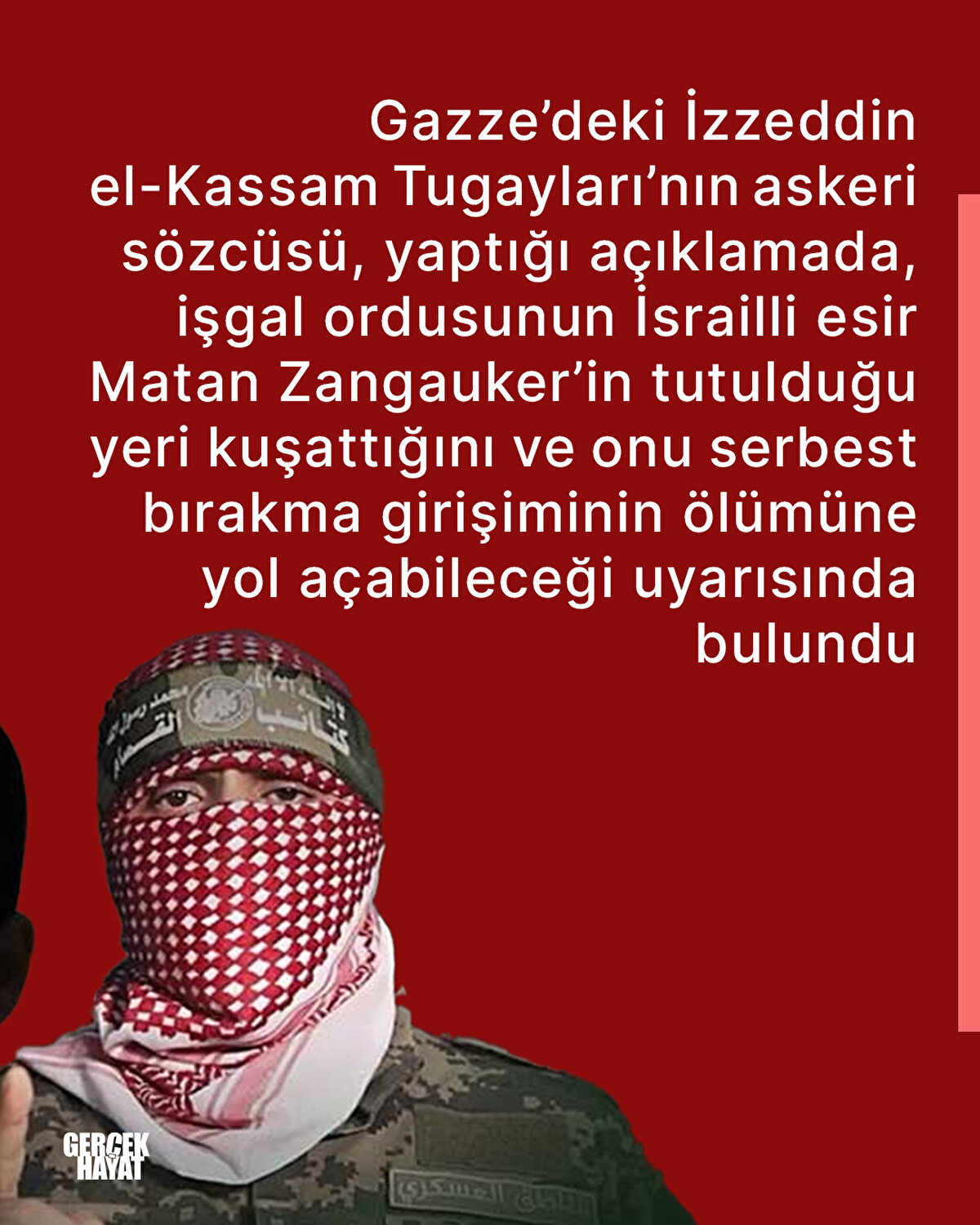 Gazze'deki İzzeddin el-Kassam Tugayları'nın askeri sözcüsü, yaptığı açıklamada, işgal ordusunun İsrailli esir Matan Zangauker'in tutulduğu yeri kuşattığını ve onu serbest bırakma girişiminin ölümüne yol açabileceği uyarısında bulunduEbu Ubeyde, Telegram kanalında yaptığı kısa açıklamada şu ifadeleri kullandı: