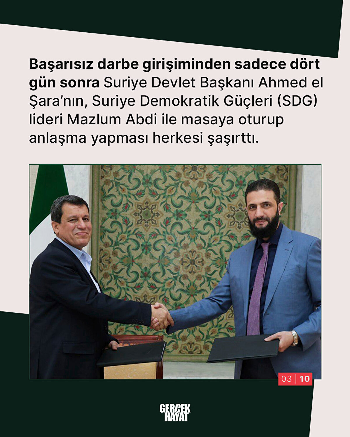Başarısız darbe girişiminden sadece dört gün sonra Suriye Devlet Başkanı Ahmed el Şara'nın, Suriye Demokratik Güçleri (SDG) lideri Mazlum Abdi ile masaya oturup anlaşma yapması herkesi şaşırttı.