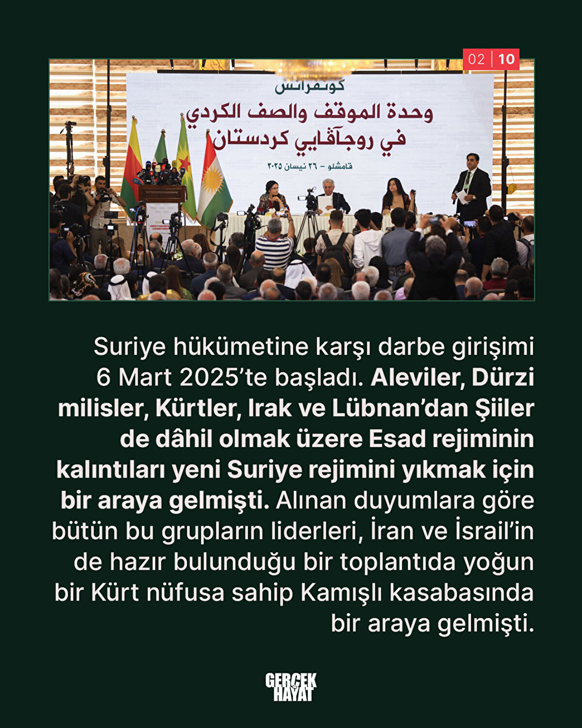 Suriye hükümetine karşı darbe girişimi 6 Mart 2025'te başladı. Aleviler, Dürzi milisler, Kürtler, Irak ve Lübnan'dan Şiiler de dâhil olmak üzere Esad rejiminin kalıntıları yeni Suriye rejimini yıkmak için bir araya gelmişti. Alınan duyumlara göre bütün bu grupların liderleri, İran ve İsrail'in de hazır bulunduğu bir toplantıda yoğun bir Kürt nüfusa sahip Kamışlı kasabasında bir araya gelmişti.
